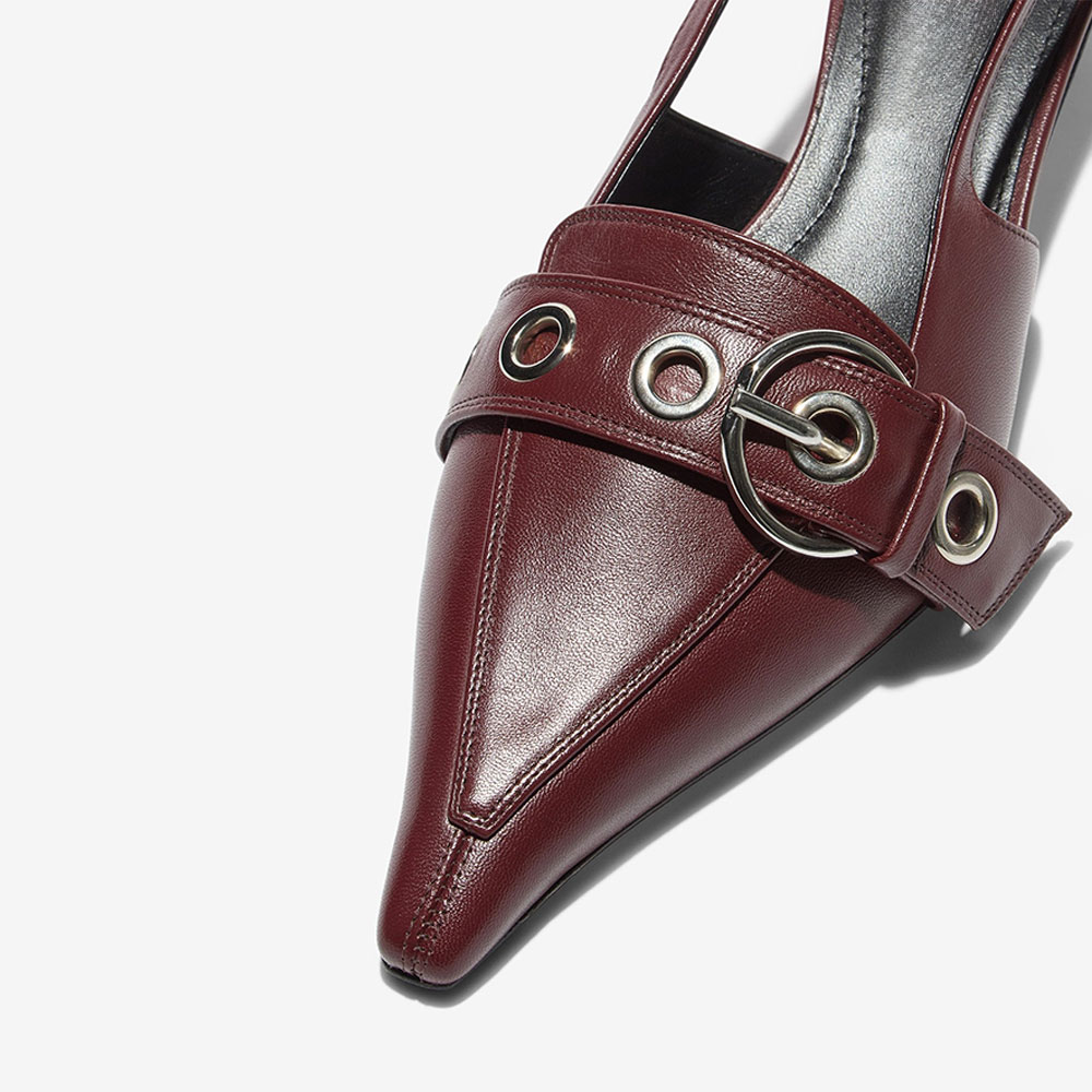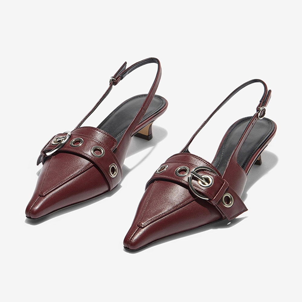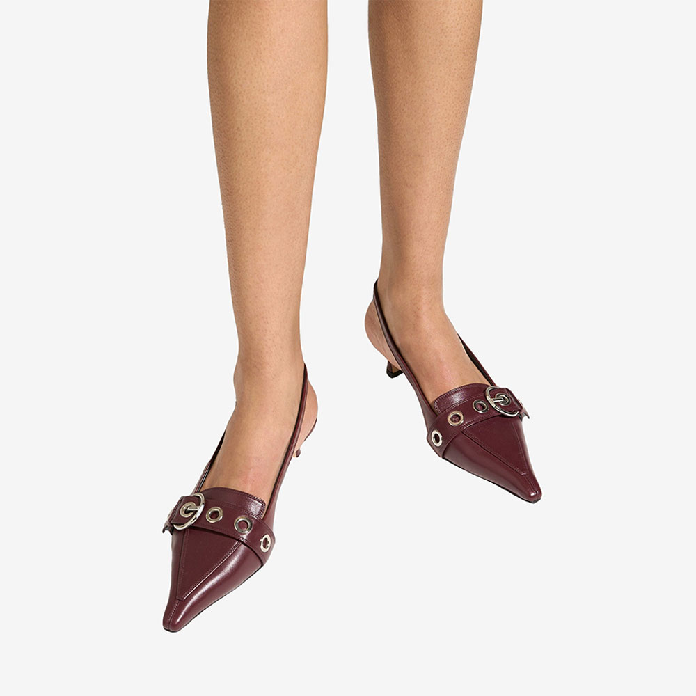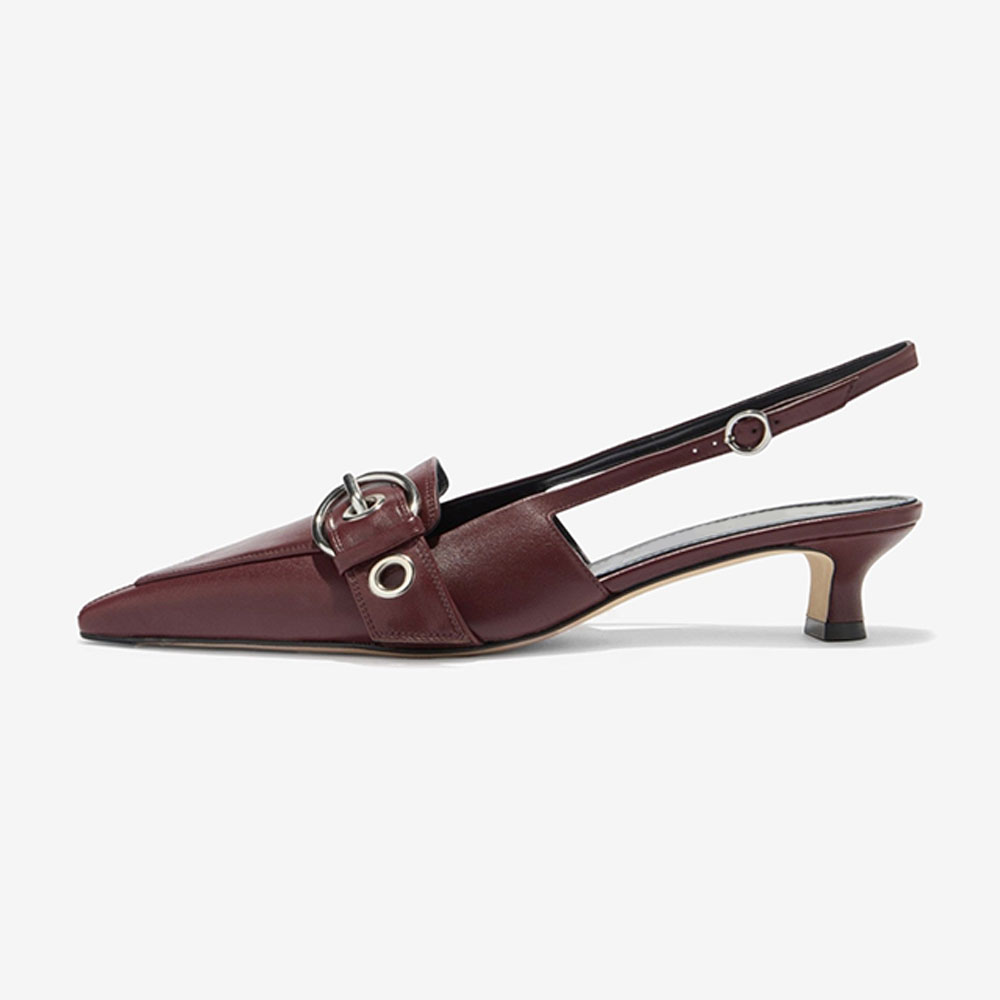 Maroon Pointed Toe Kitten Heel Buckled Slingback Pumps for Women