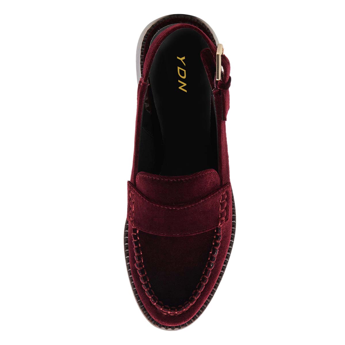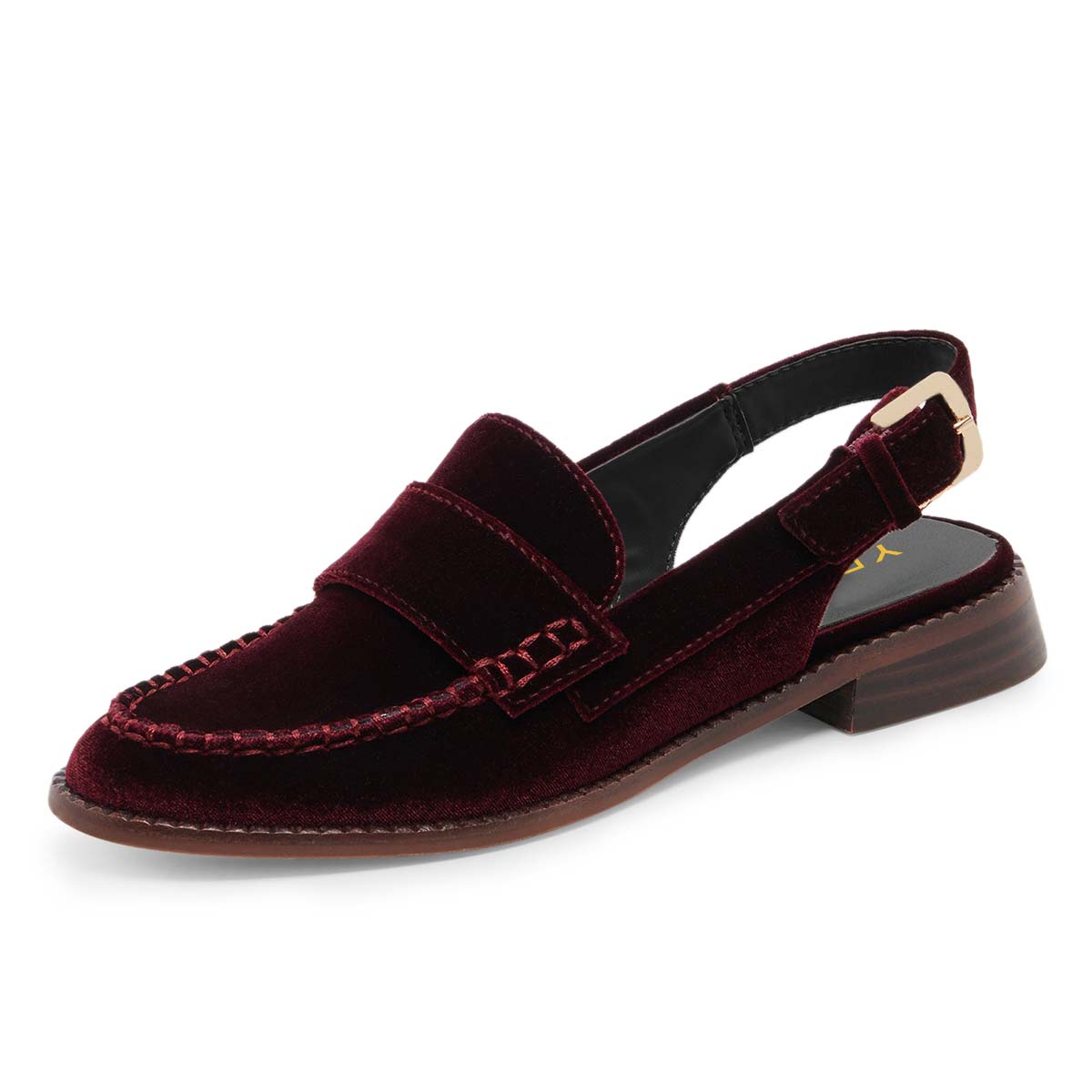 Special Designs: Maroon loafers featuring an adjustable buckle fastening slingback pattern and slip-on convinience.