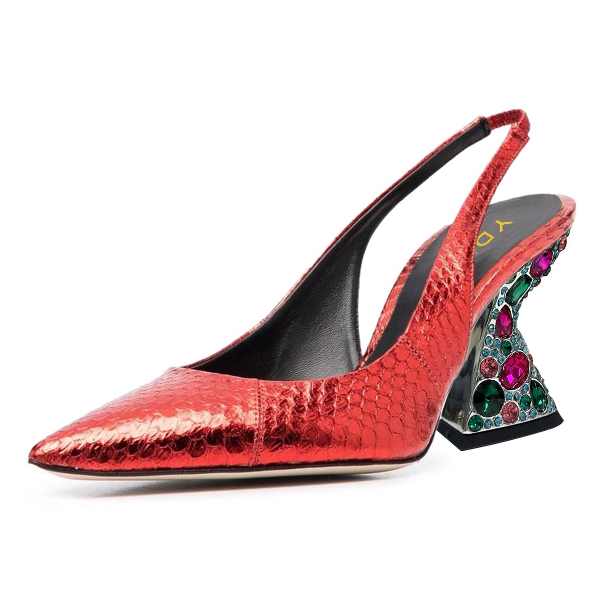 • Special Designs: Red croc-embossed pumps feature a rhinestoen embellished heel and a slingback design.