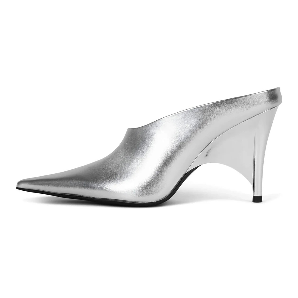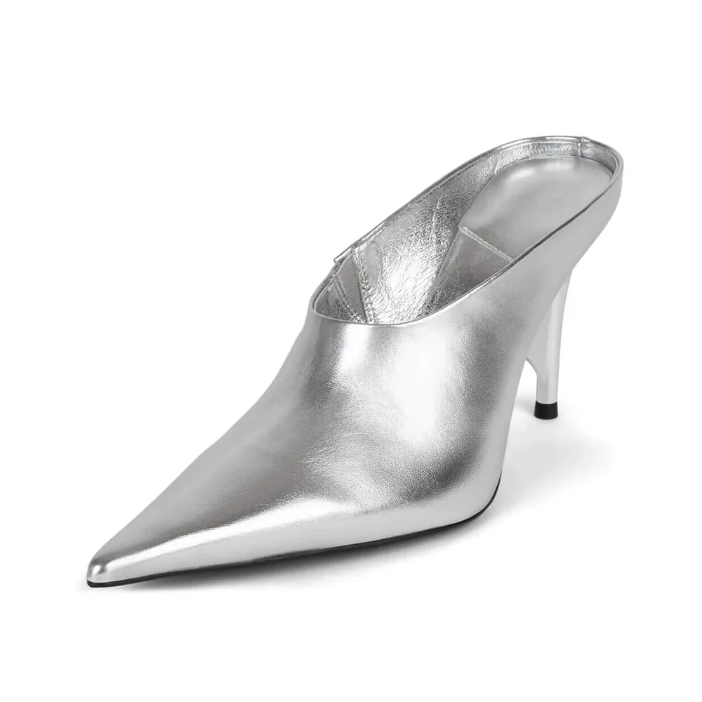 Metallic Finish Pointed Toe Simple High Heel Mules in Silver