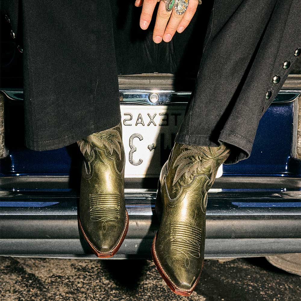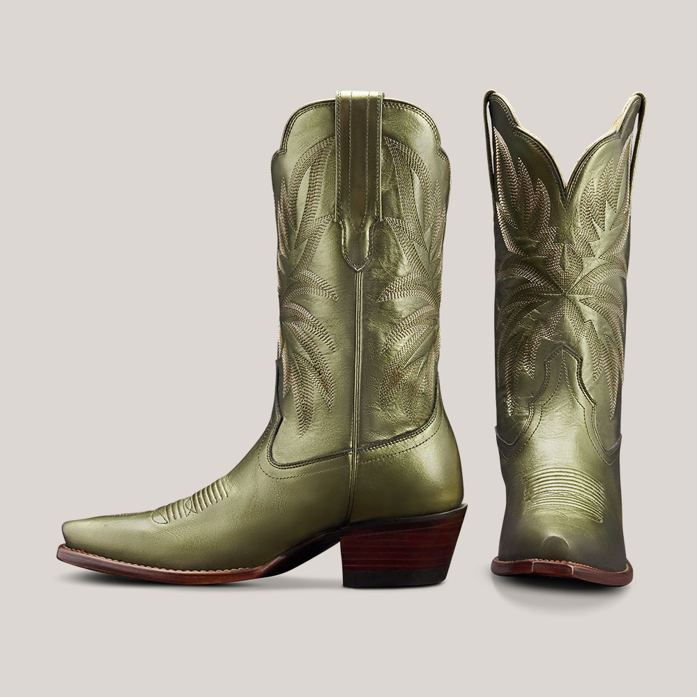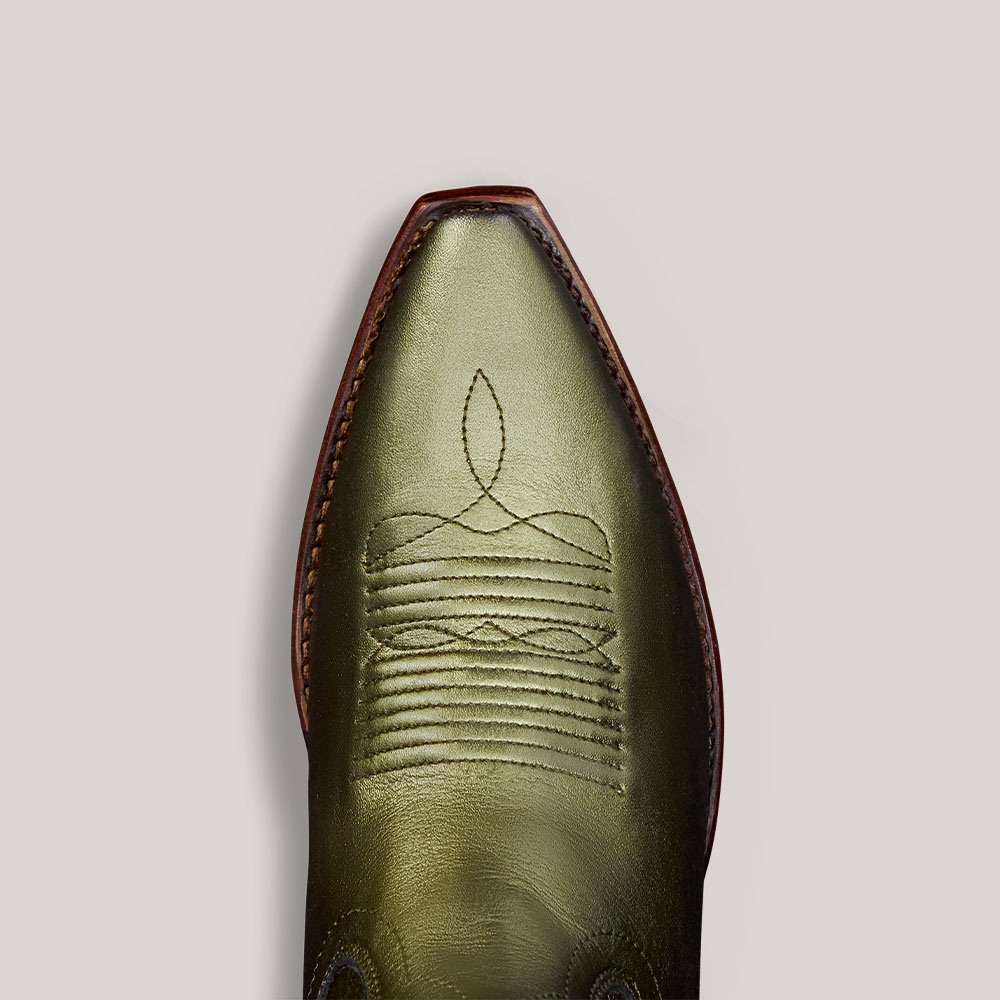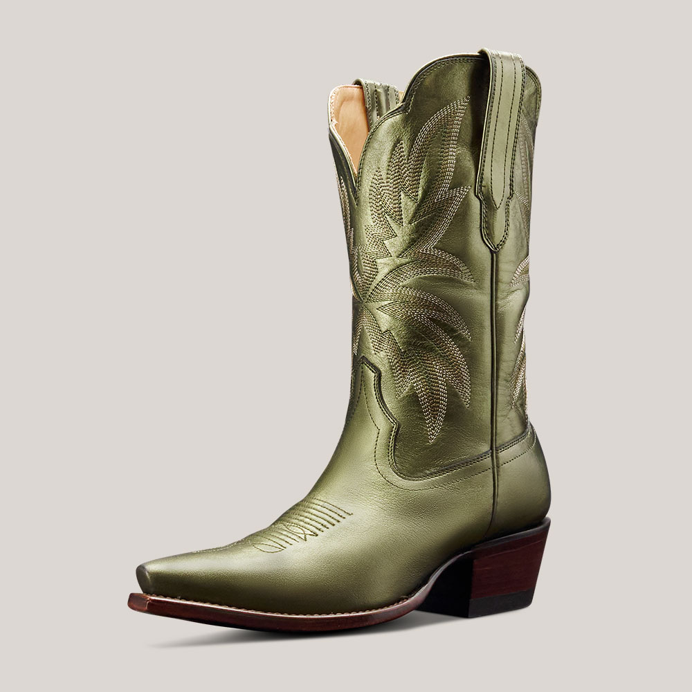 Metallic Olive Snip Toe Mid Calf Embroidered Cowboy Boots for Women