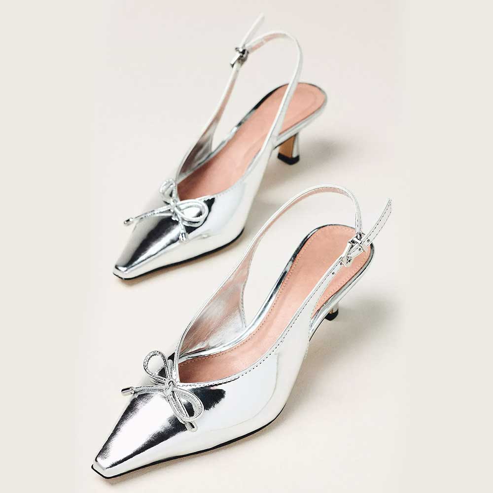 Special Designs: The silver slingback pumps have a pointed toe, a delicate bow detail,