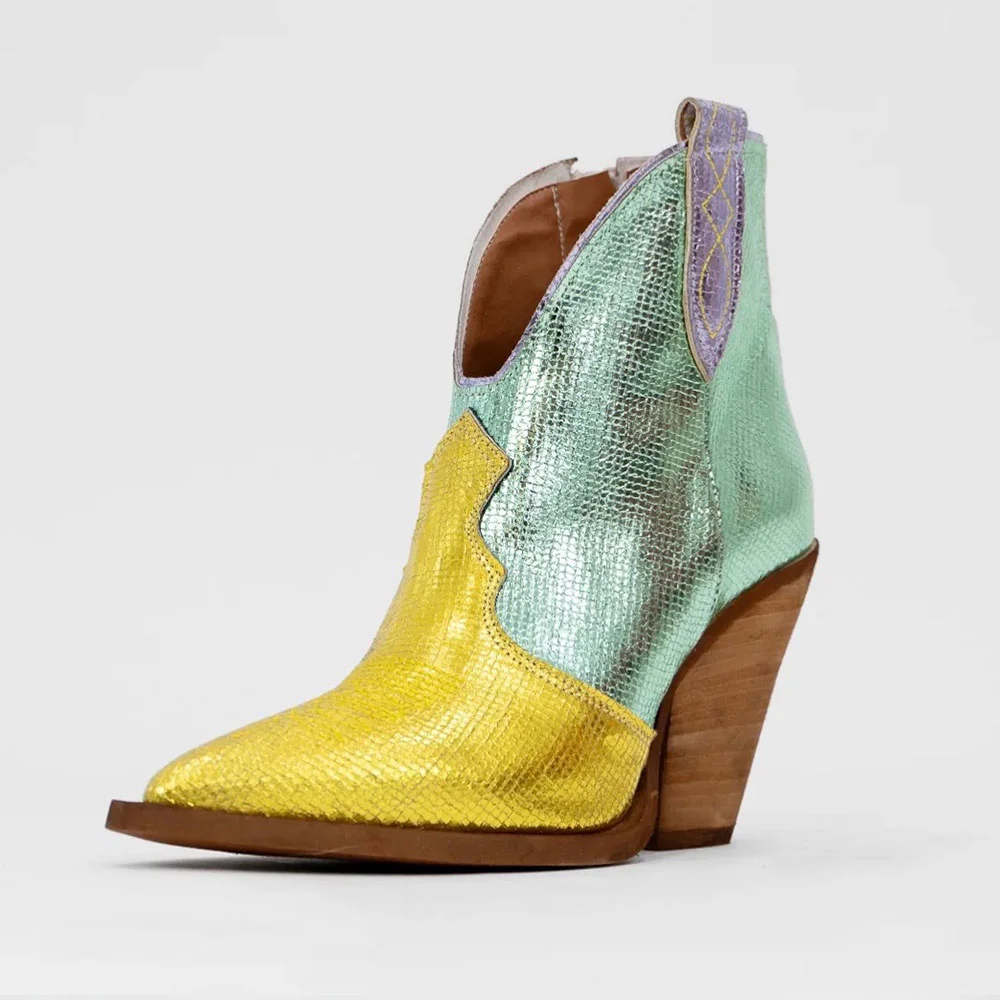 Metallic Yellow & Green Pointed Toe Block Heel Ankle Cowgirl Boots
