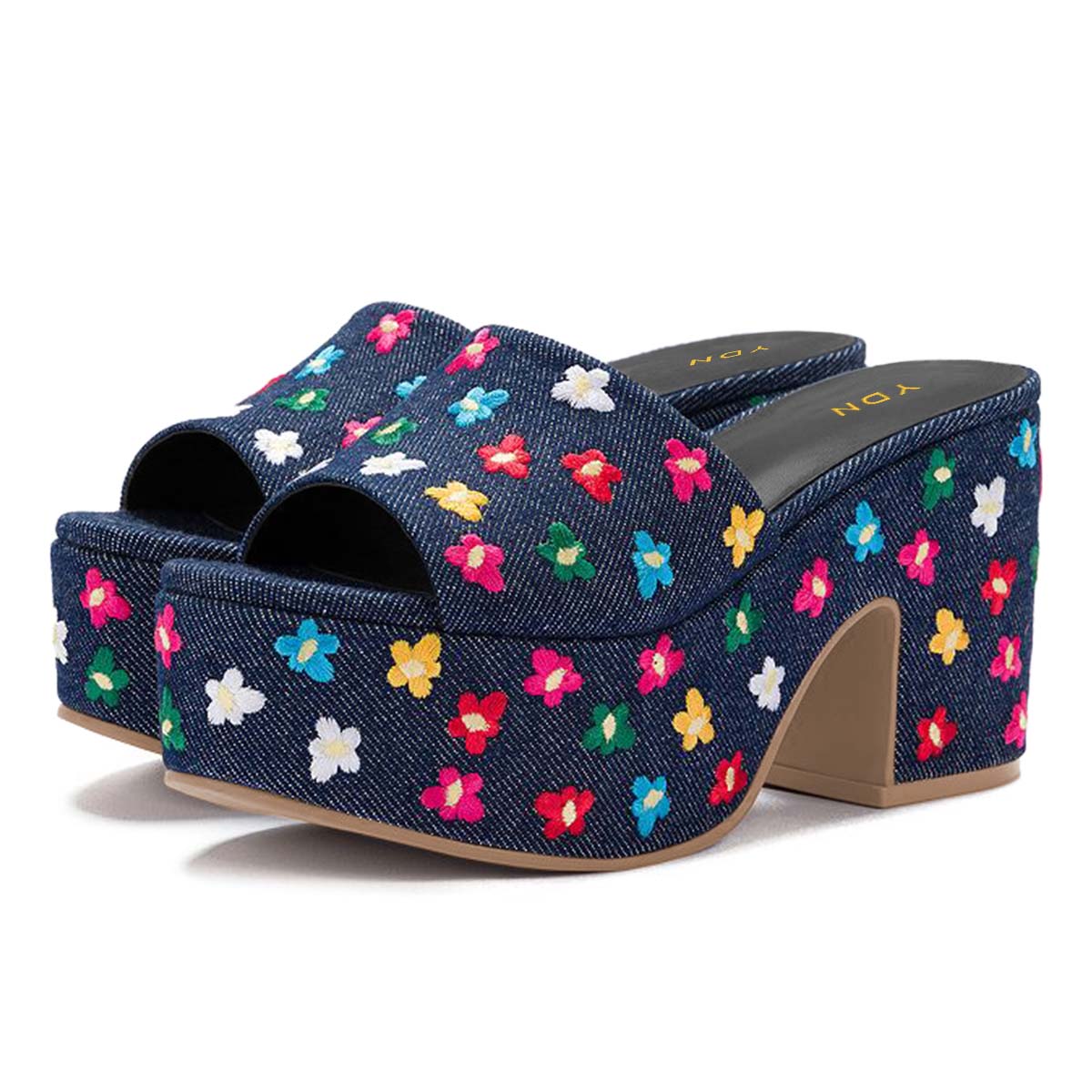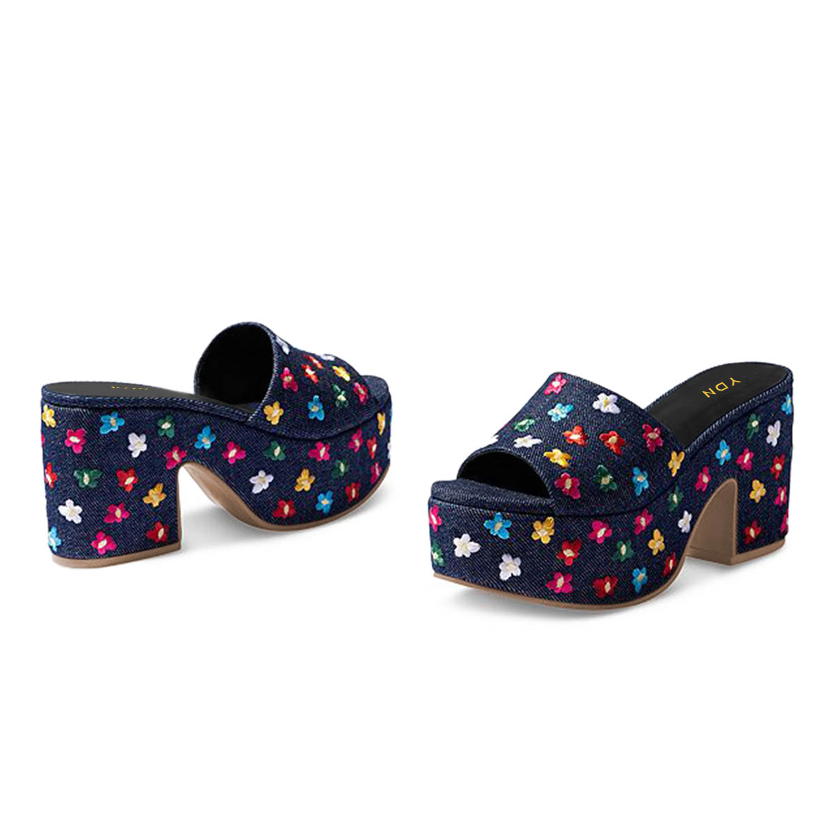 Multicolor Denim Open Toe Flower Embroidery Platform Mules Sandals