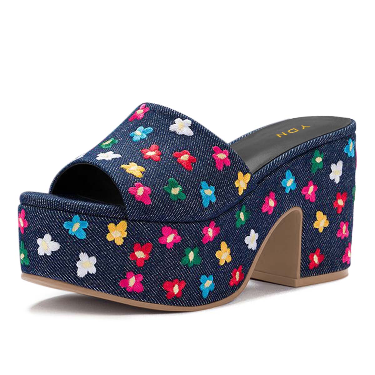 Special Designs: The open-toe platform mules sandals feature chunky heels and a multicolor flower embroidery.