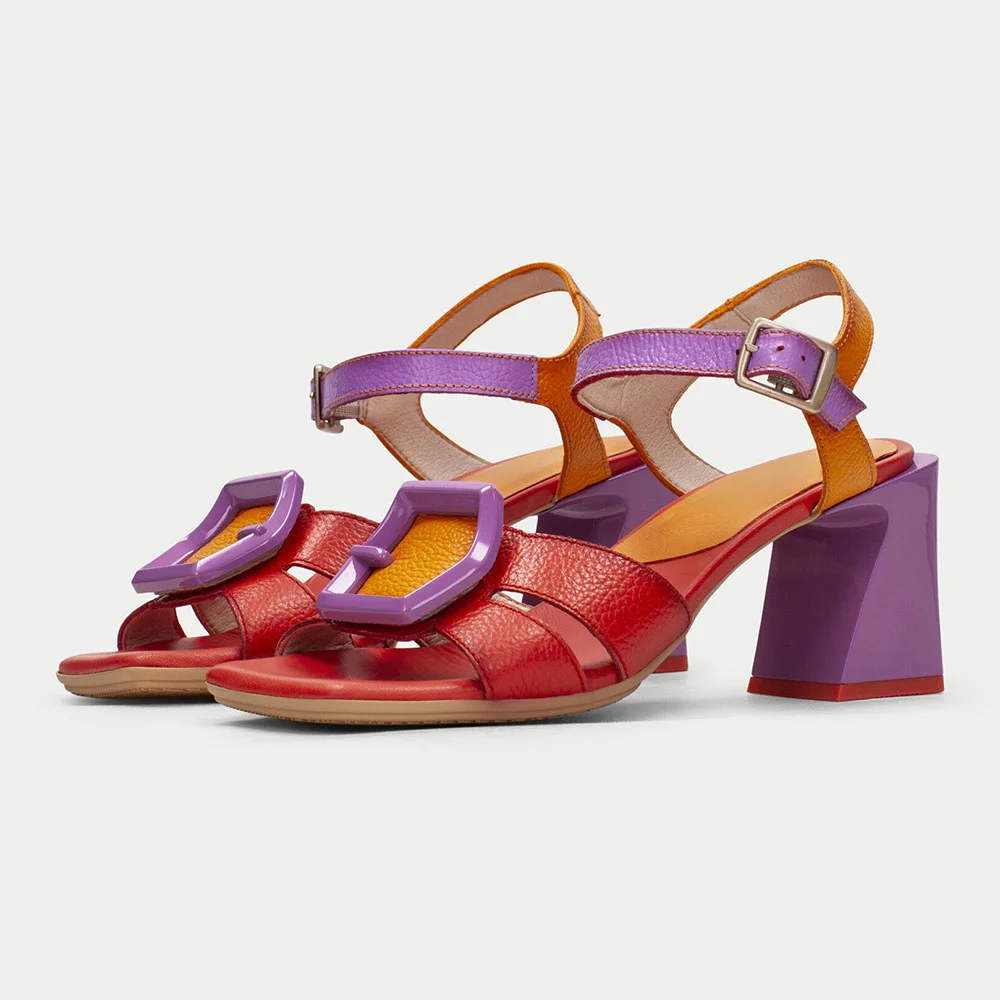 • Special Designs: The heeled sandals feature a stylish color block design, combining red, purple, and orange, with a toe strap adorned with a purple geometric-shaped buckle and an ankle strap secured by a gold buckle.