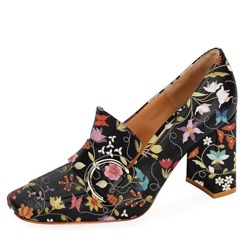Special Designs: The square-toe chunky heel loafers feature a buckle strap decoration and a delicate floral print design.