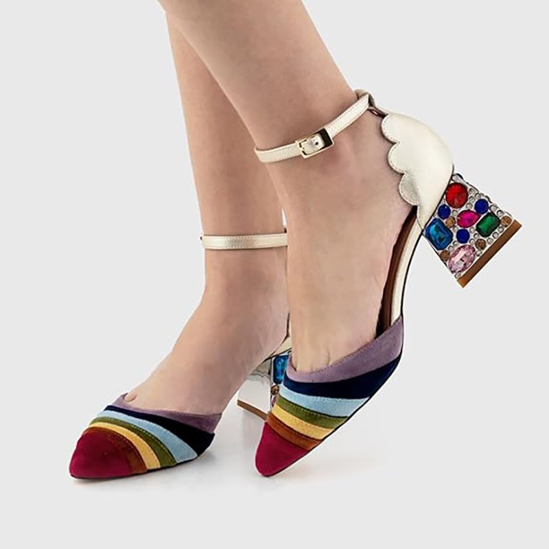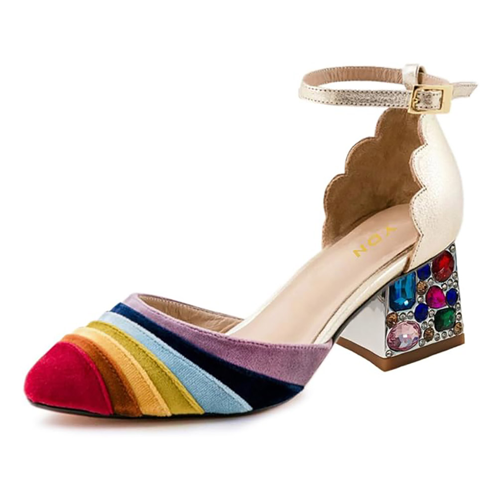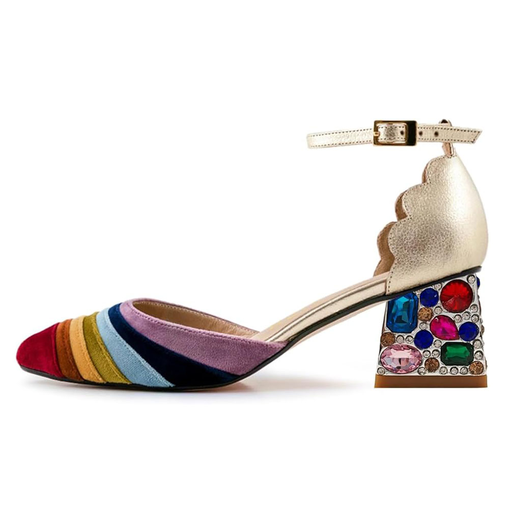 Multicolor Patchwork Ankle Strap Rhinestone Block Heel Pumps Shoes