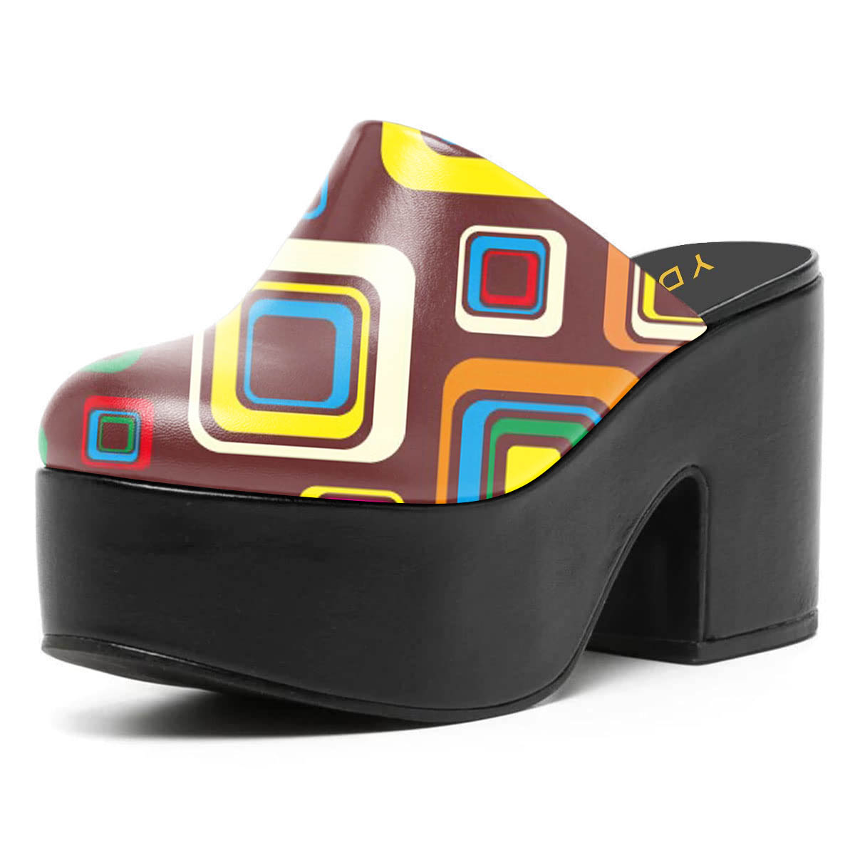 Special Designs: The platform mule shoes feature a multicolor square print with a round toe and a block heel design.
