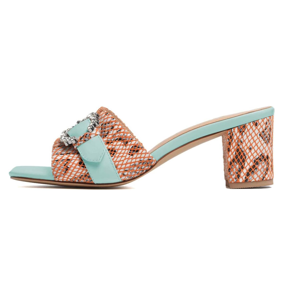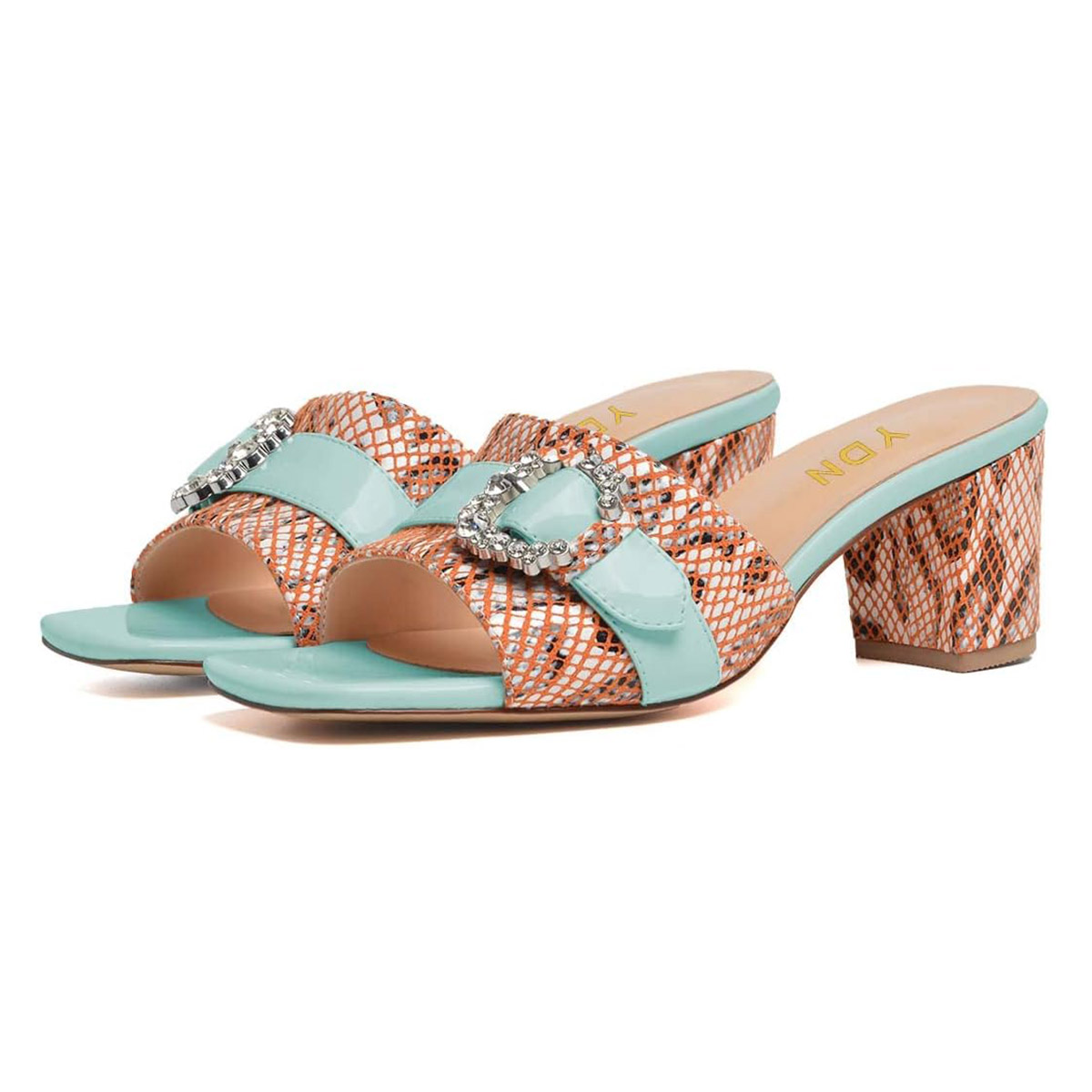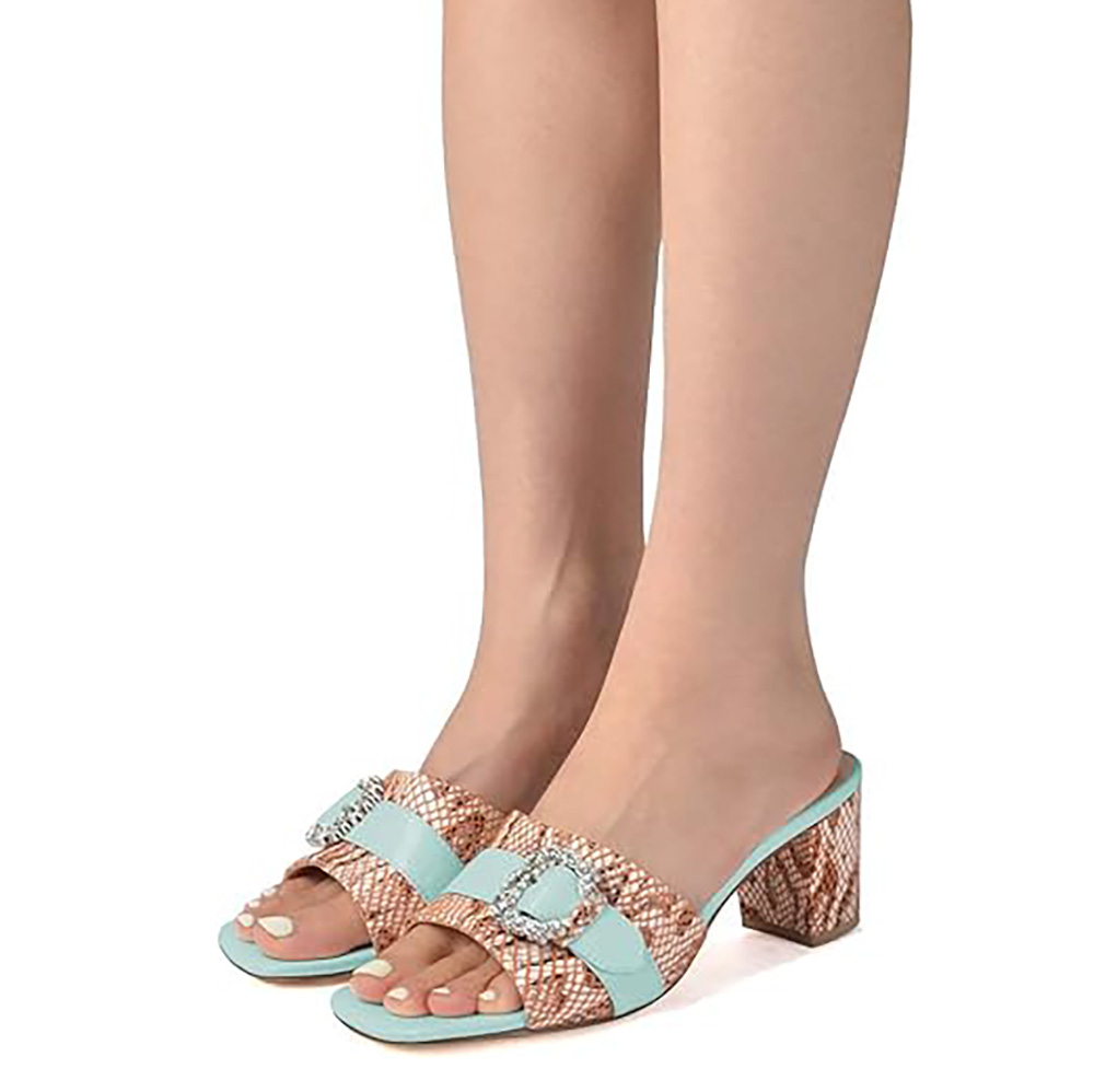 Multicolor Square Toe Rhinestone Buckle Block Heel Mules Sandals
