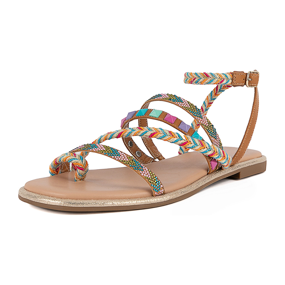 Multicolor Studded Square Toe Braided Strappy Flat Sandals for Women