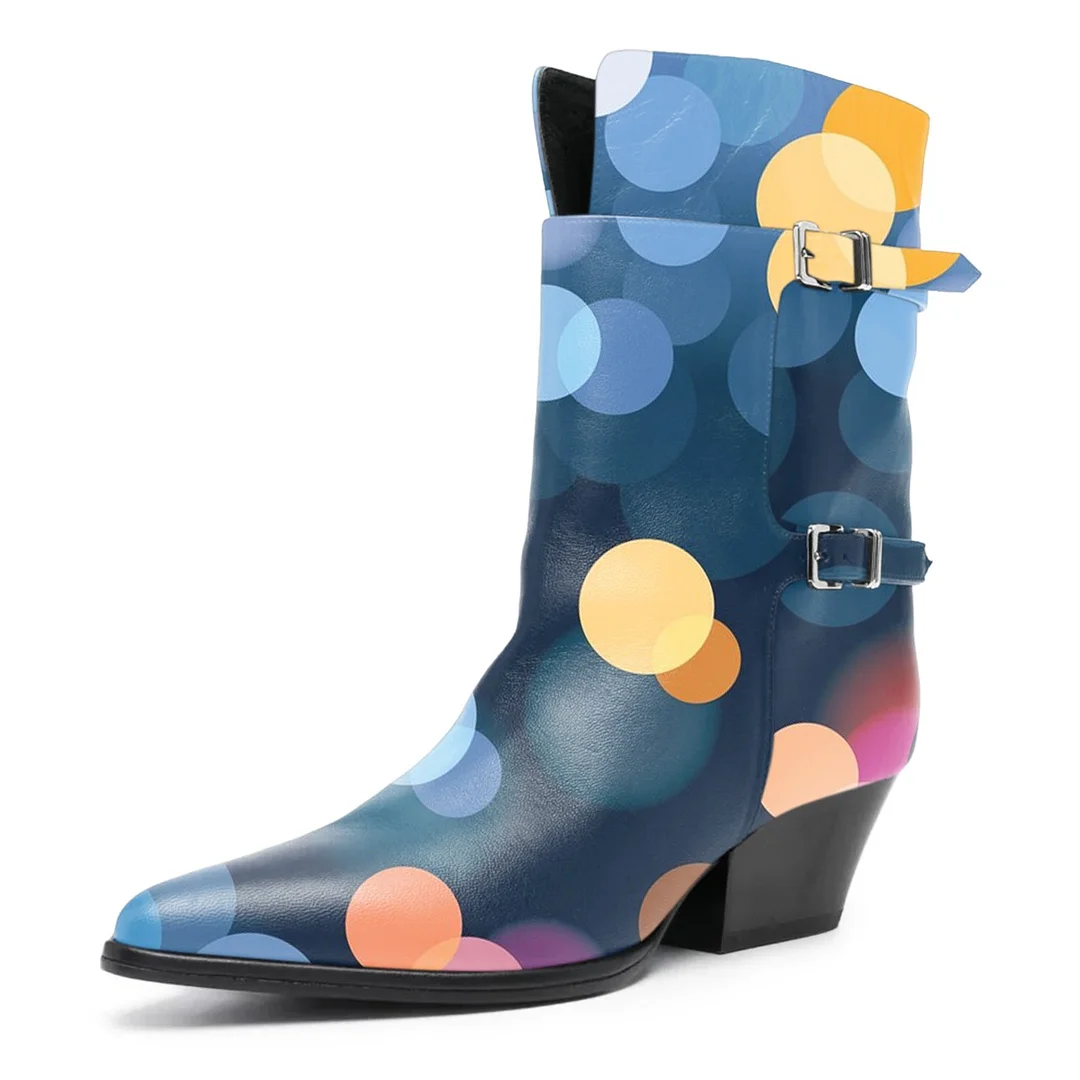 • Special Designs: The heeled ankle boots feature a vibrant polka-dot pattern in hues of blue, yellow, orange, and pink on a dark blue base, and two silver buckled straps.