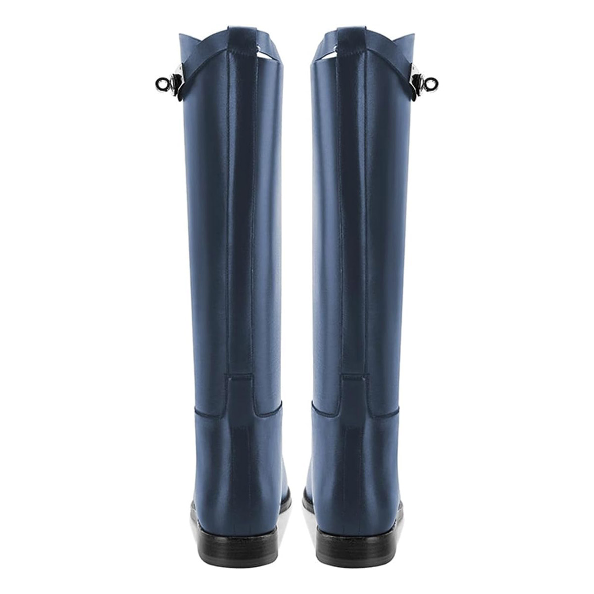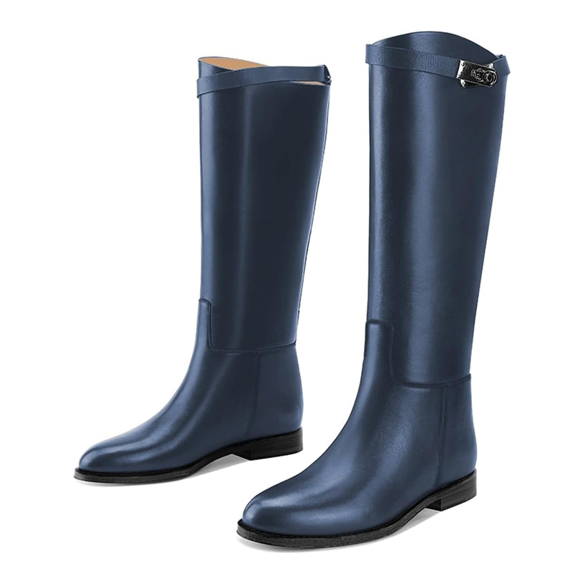 Special Designs: The long boots feature a classic navy color, a round toe, and an adjustable iconic silver buckle design.