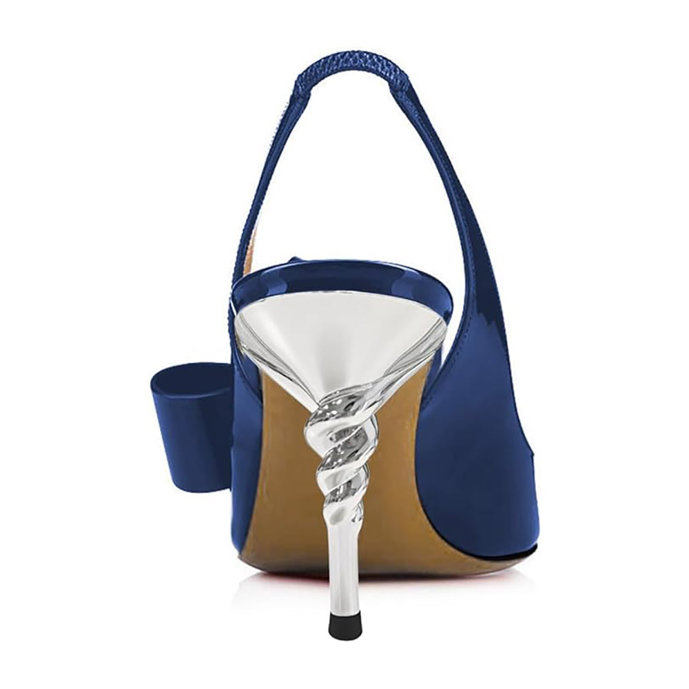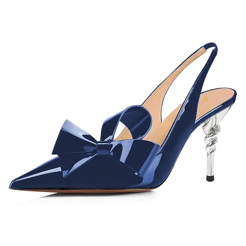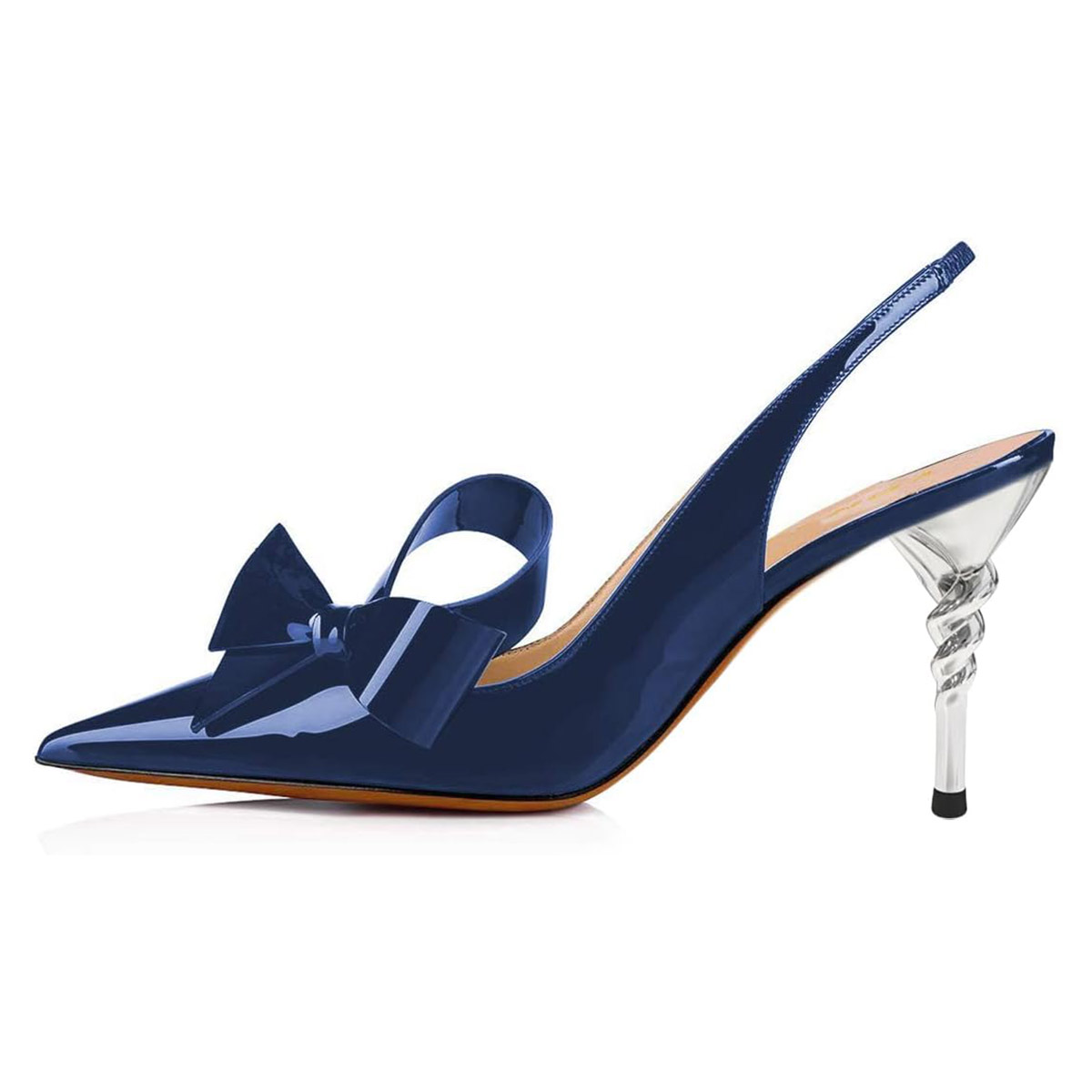 Navy Patent Leather Decorative Heel Bow Slingback Pumps Shoes