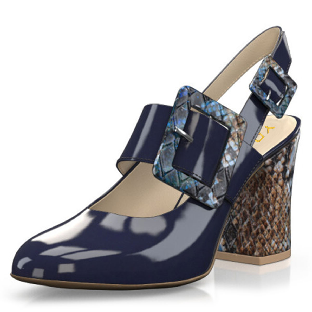 Navy Patent Leather Round Toe Buckle Snakeskin Pumps for Women