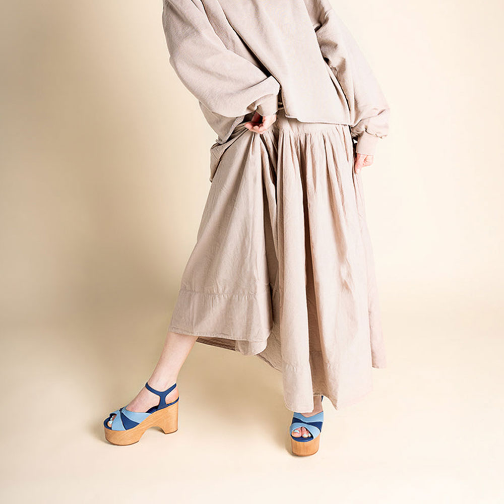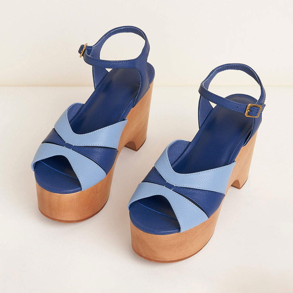 Navy & Sky Blue Peep Toe Ankle Strap Clog Heels with Platform