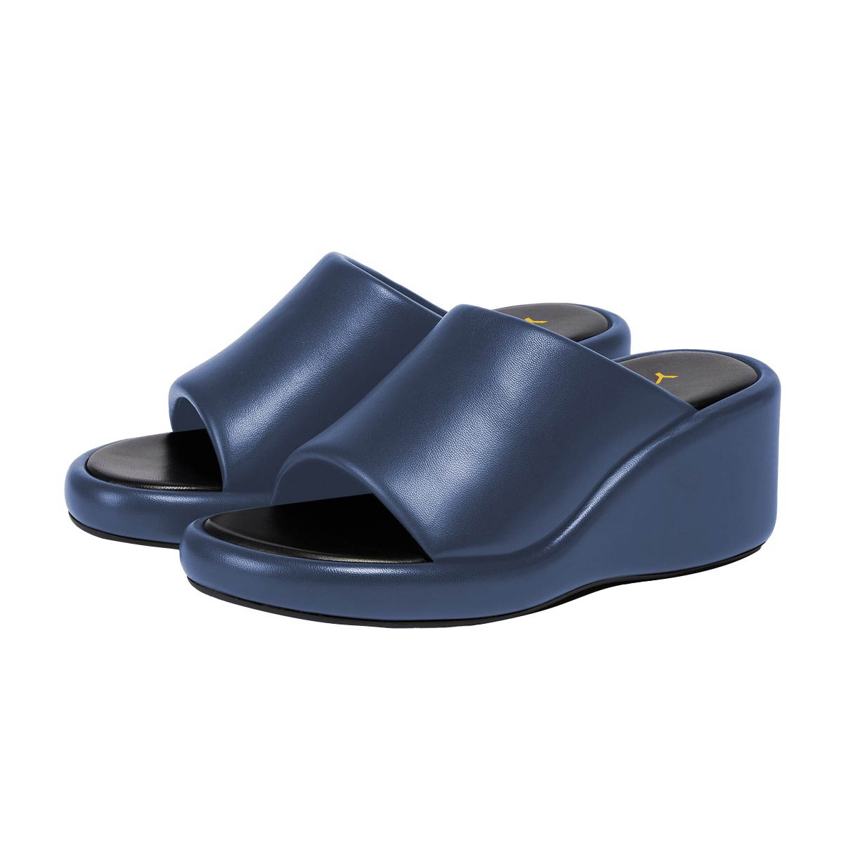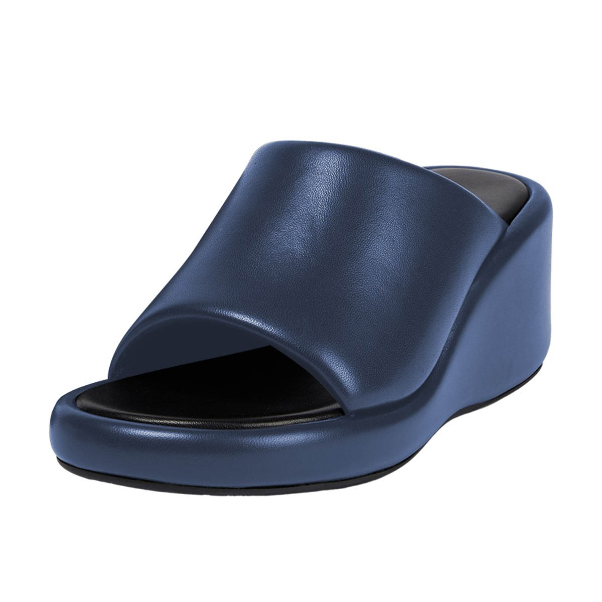 Navy Vegan Leather Open Round Toe Wedge Heel Mules Sandals