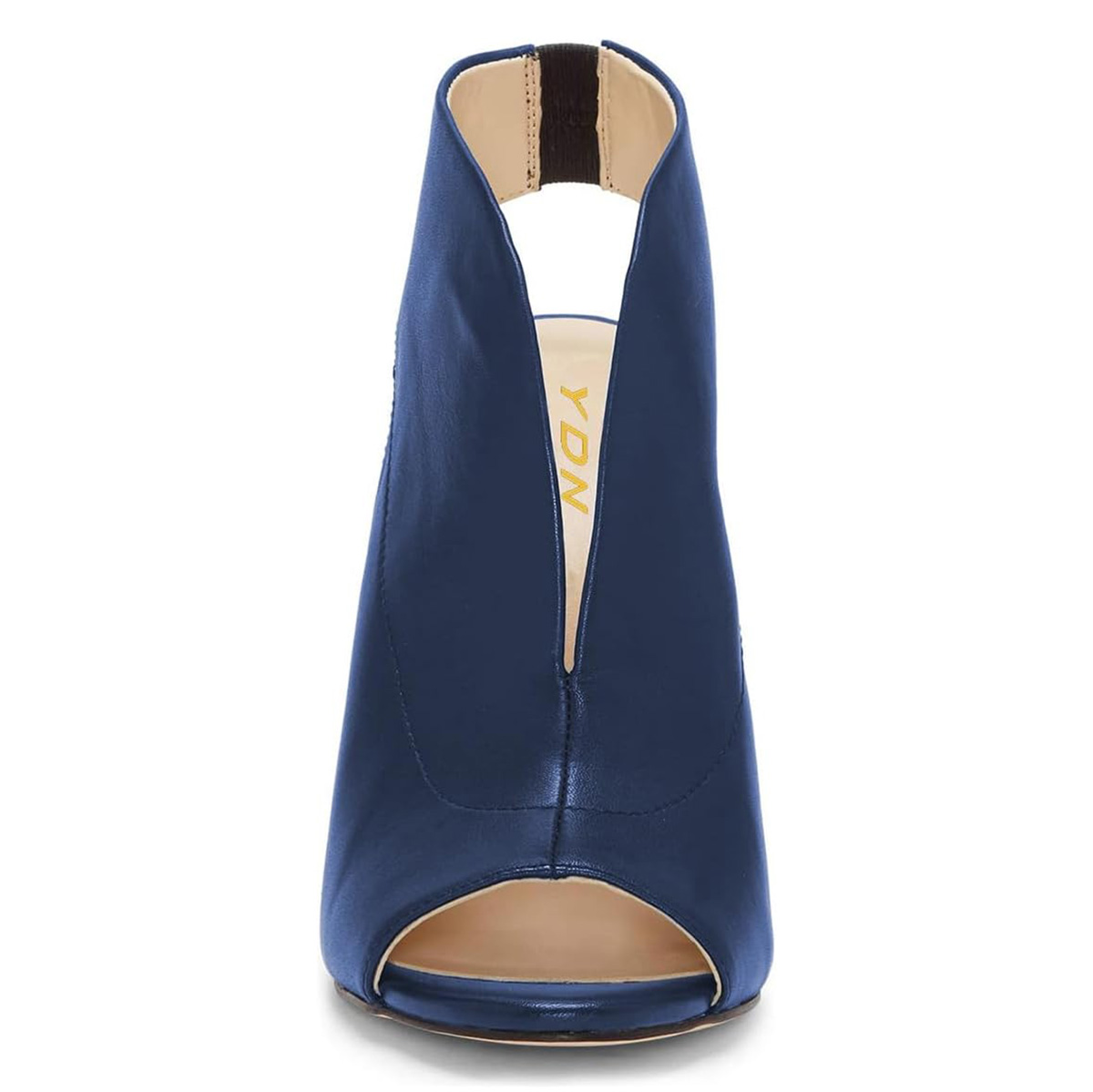 Special Designs: Navy sandals featuring a front V cut and a back strap design.