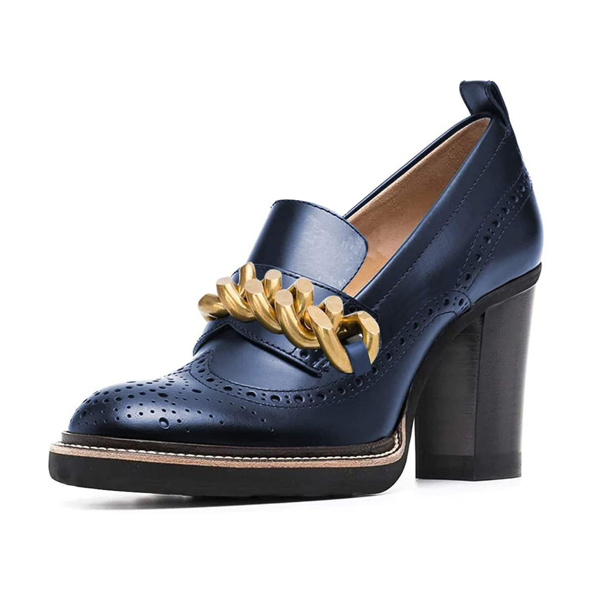 Special Designs: The round-toe loafers feature chunky heels, chain, and a Brogue-style design.