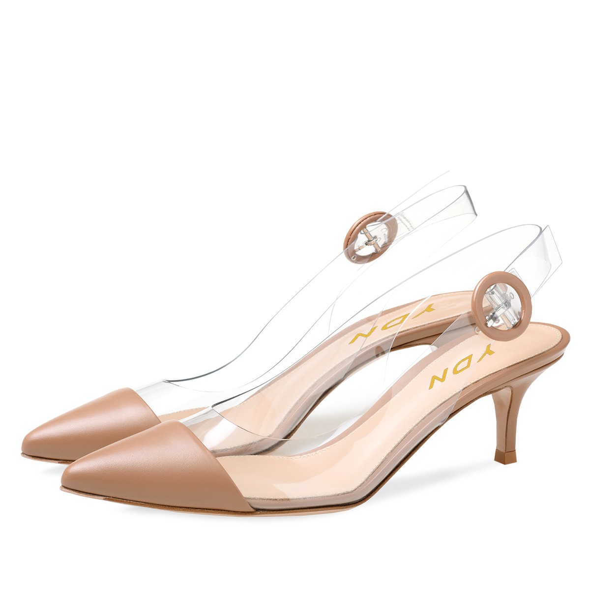 Special Designs: These pumps feature a nude pointed toe, clear PVC straps, a slingback design with a circular buckle, and a slender kitten heel.