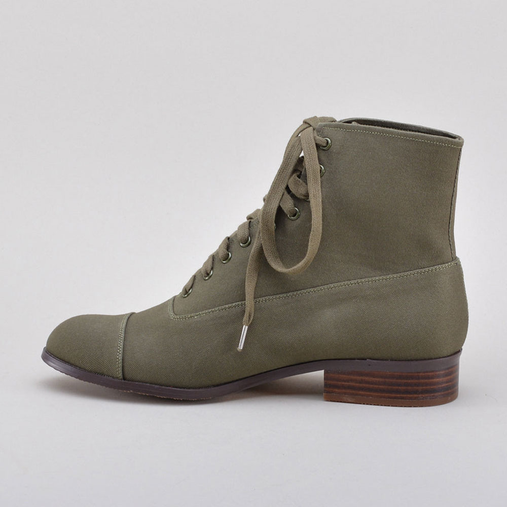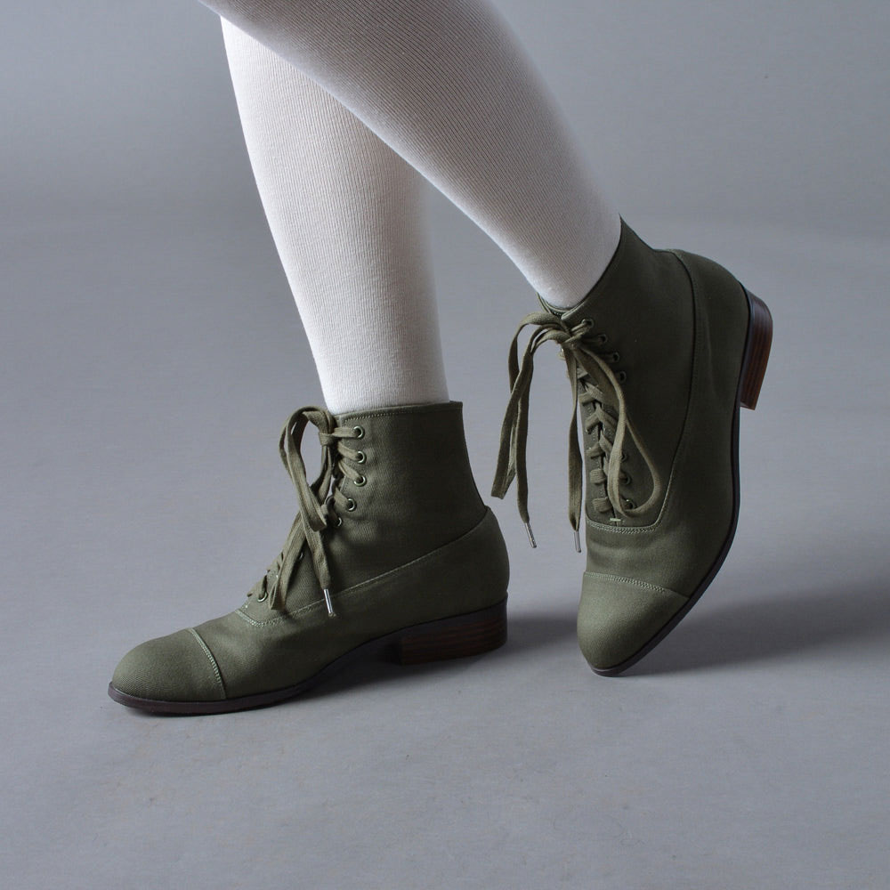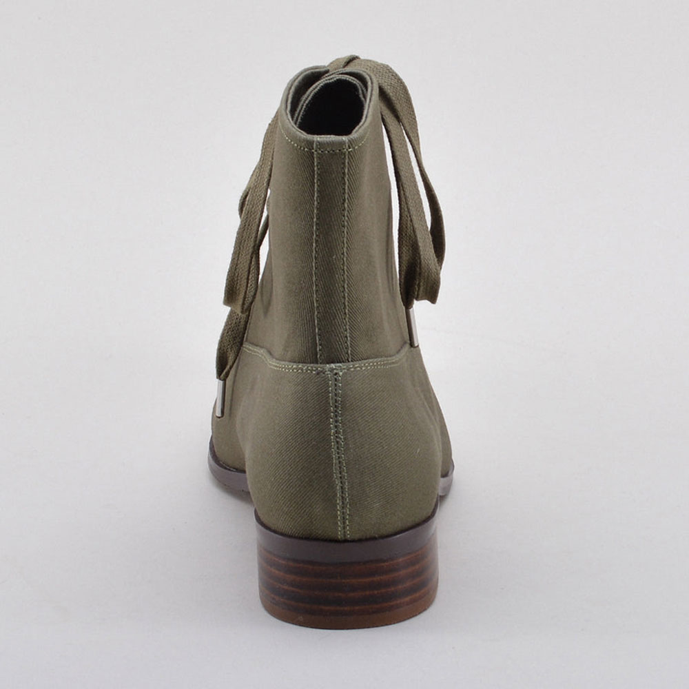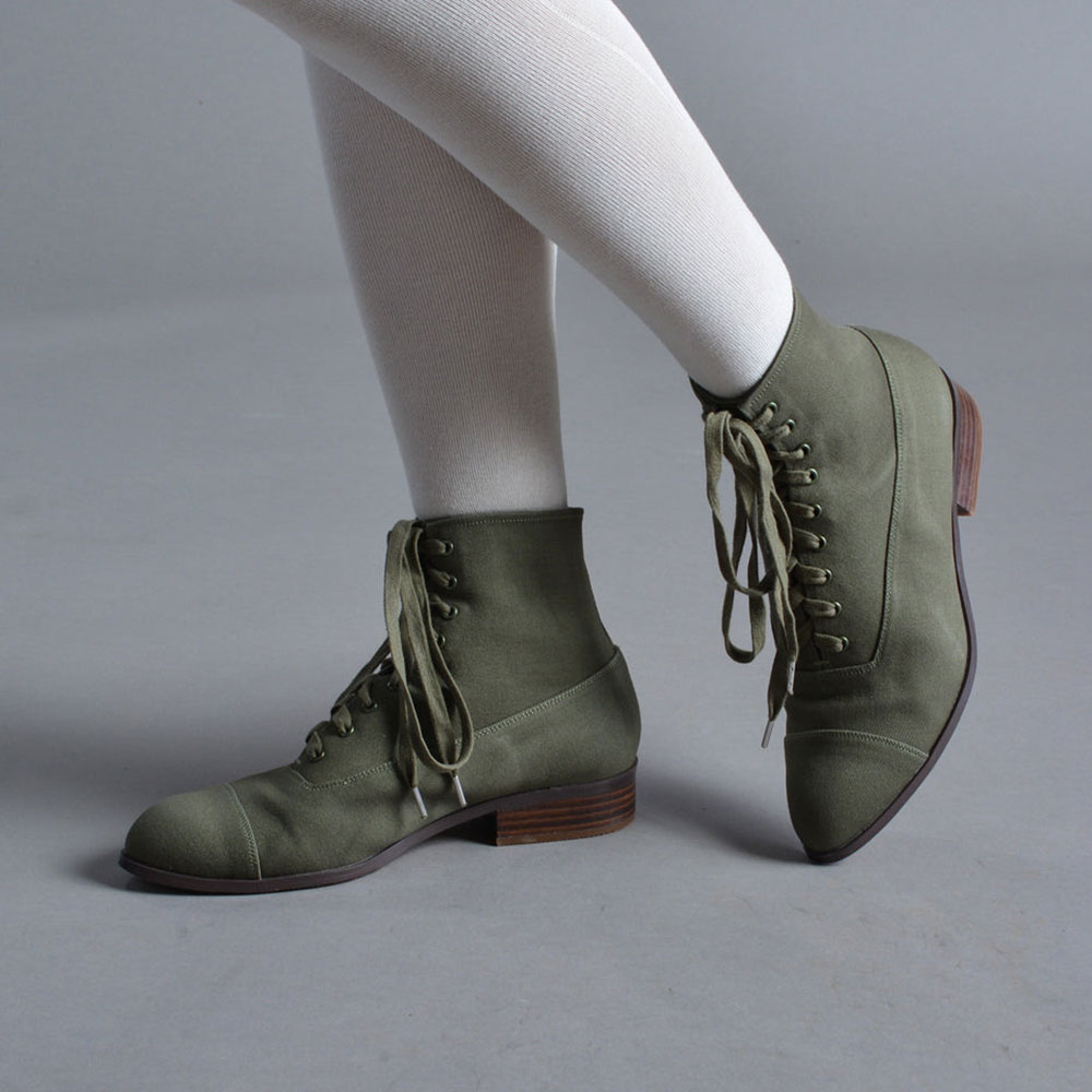 Olive Canvas Round Toe Stacked Heel Lace-Up Booties for Women