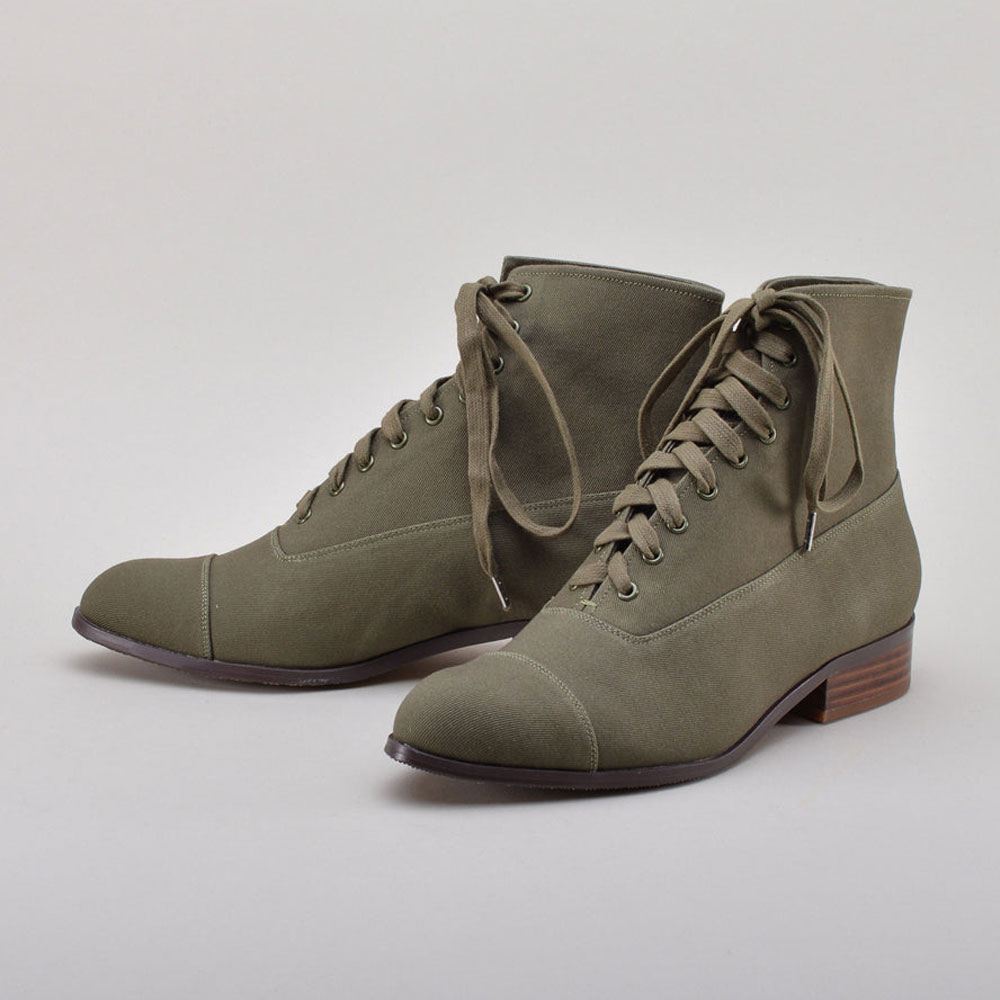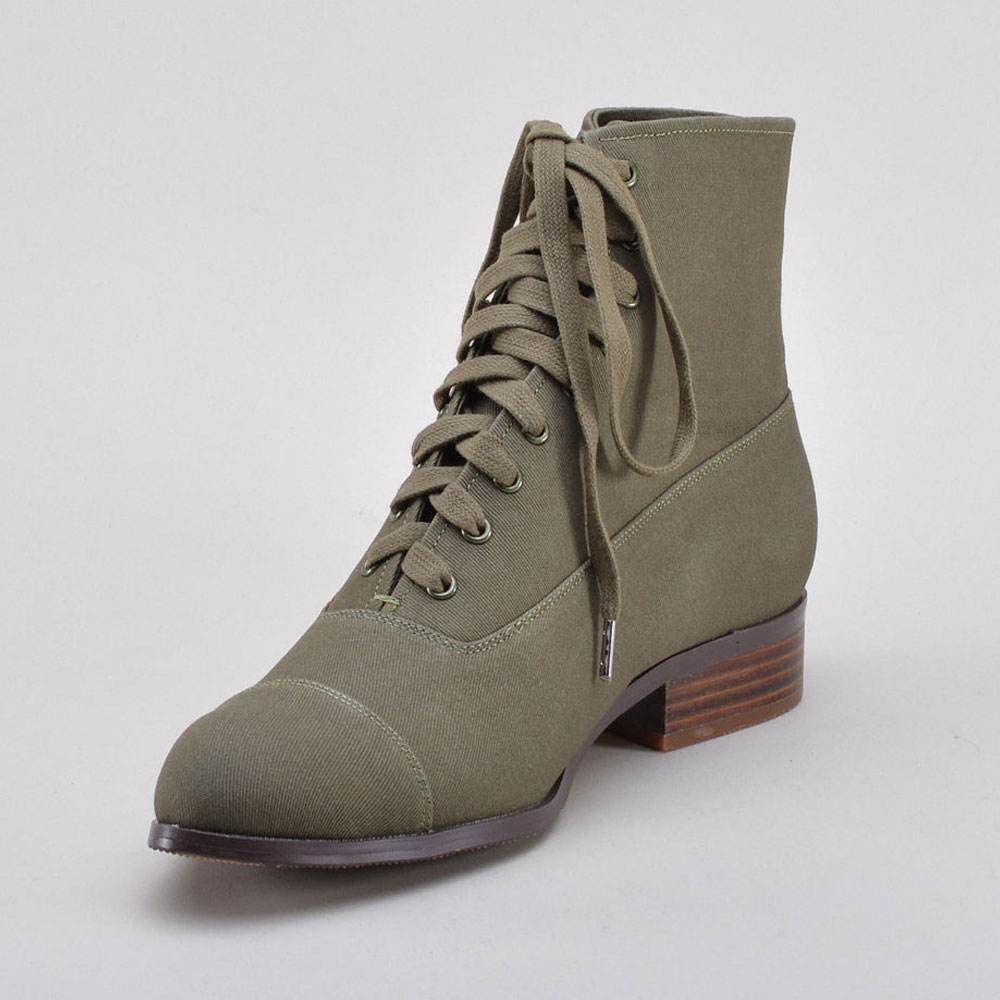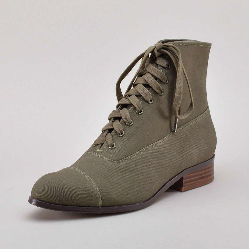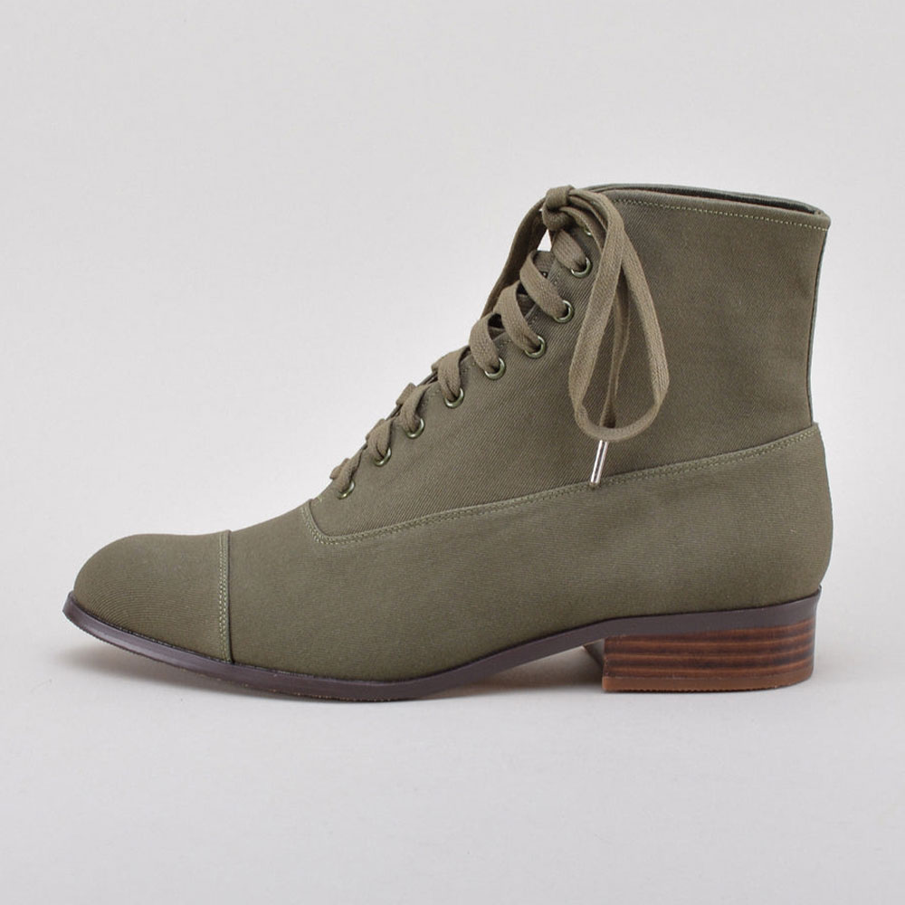 Olive Canvas Round Toe Stacked Heel Lace-Up Booties for Women