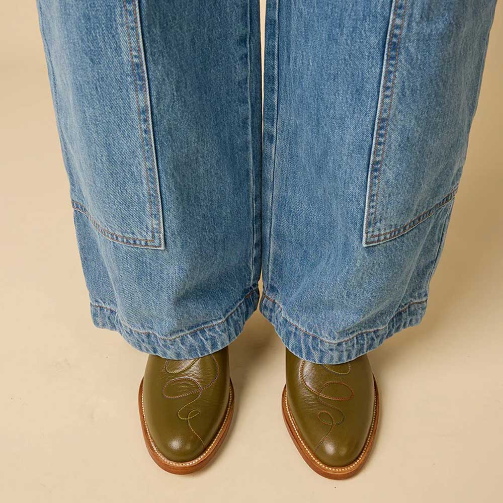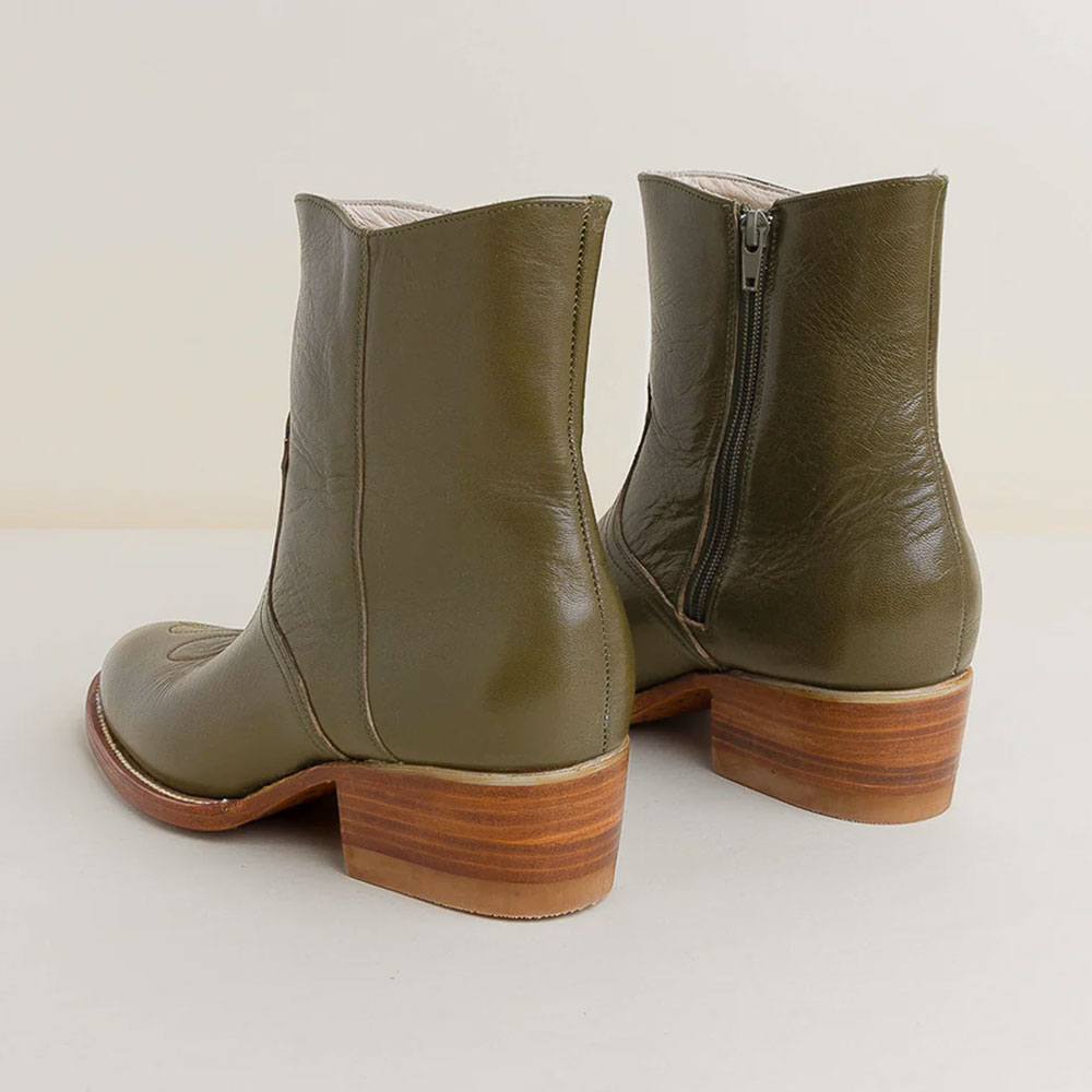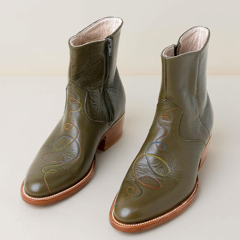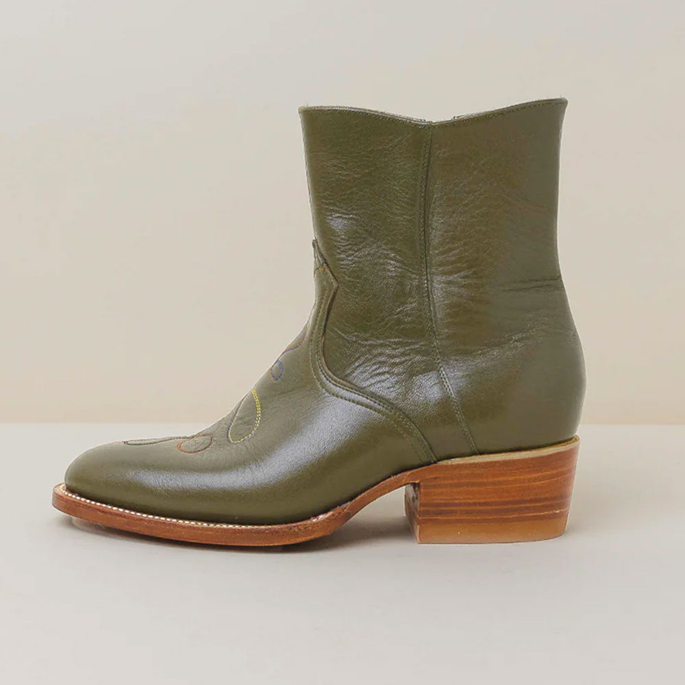Olive Closed Toe Zipper Embroidered Ankle Cowgirl Boots for Women