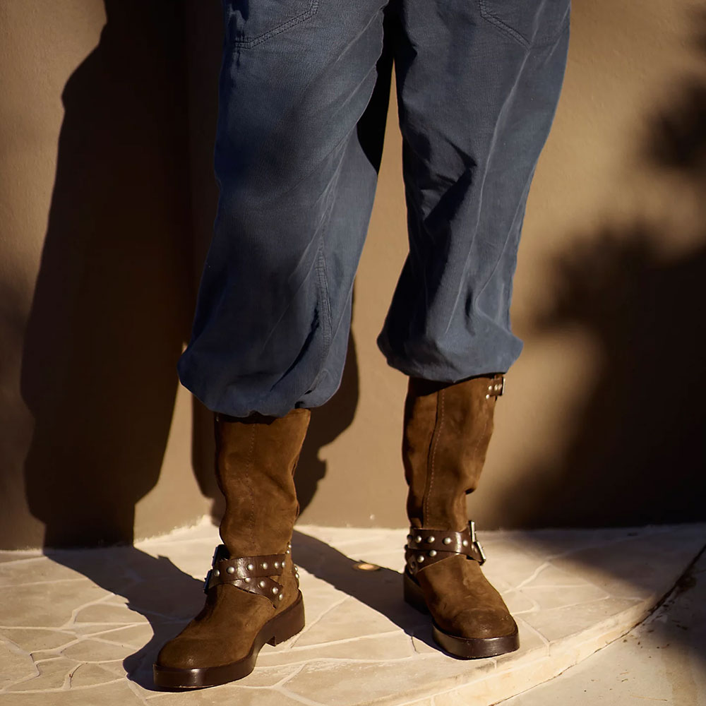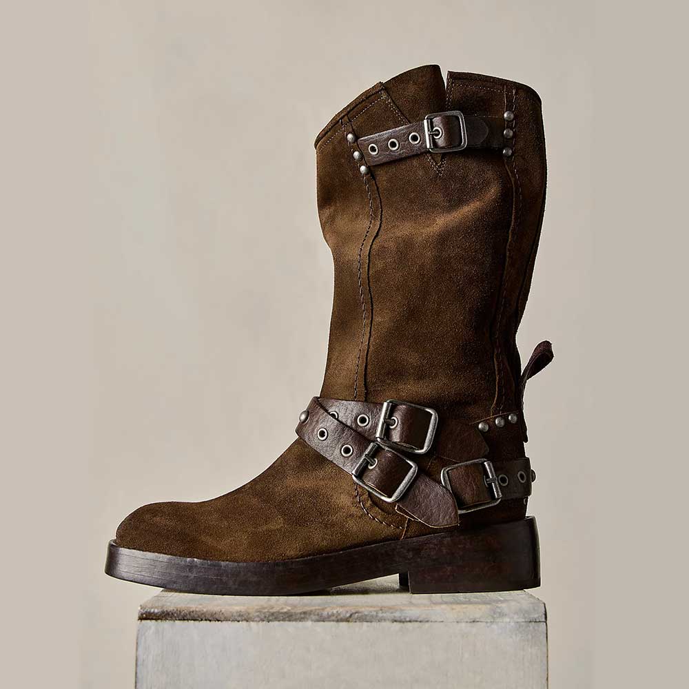 Special Designs: The olive vegan suede motorcycle boots are mid-calf length and feature grommet buckle accents at the top line and camp, along with studded detailing.