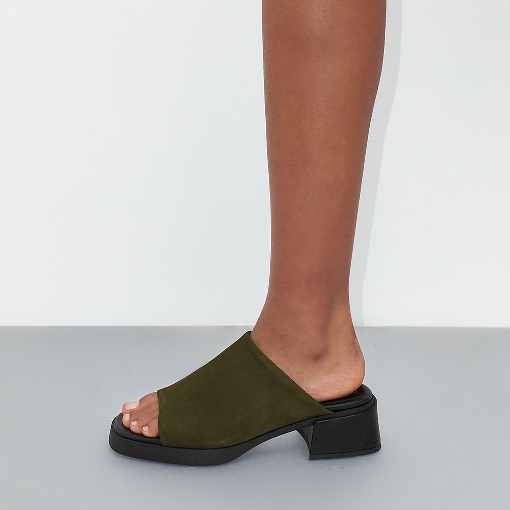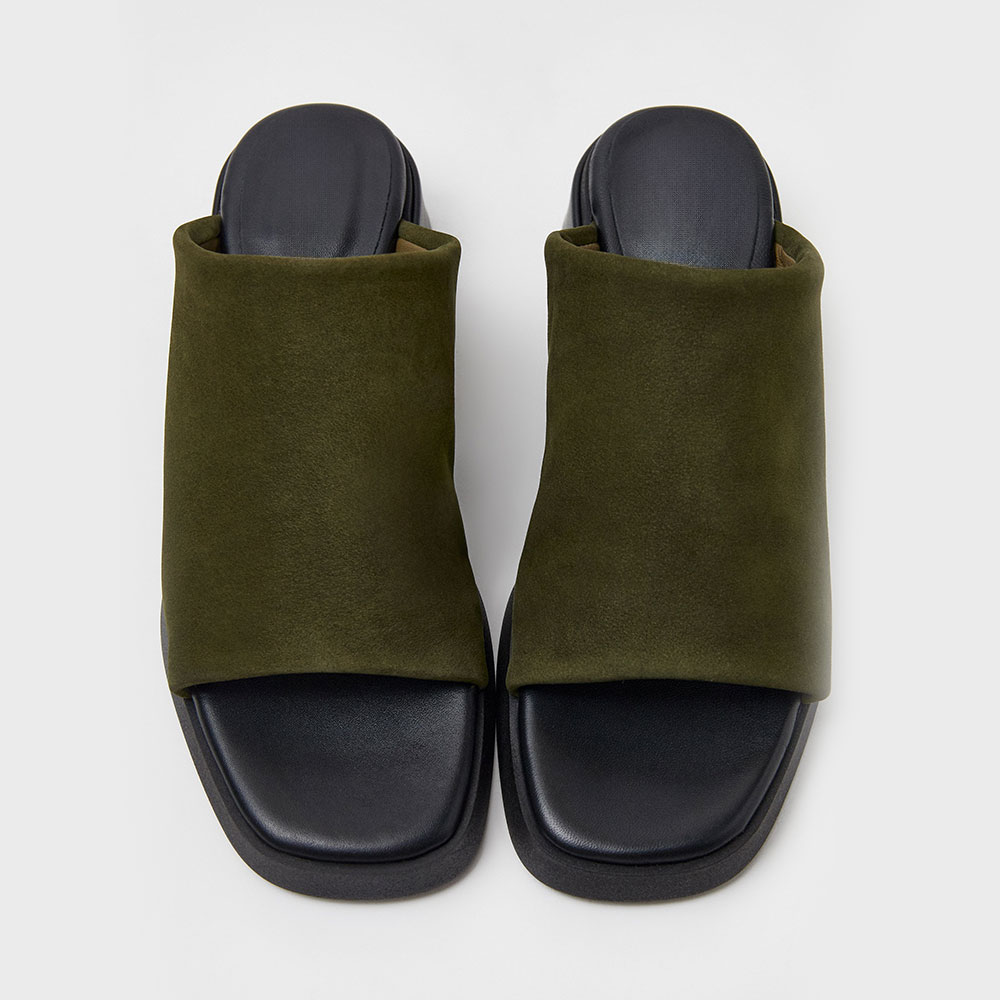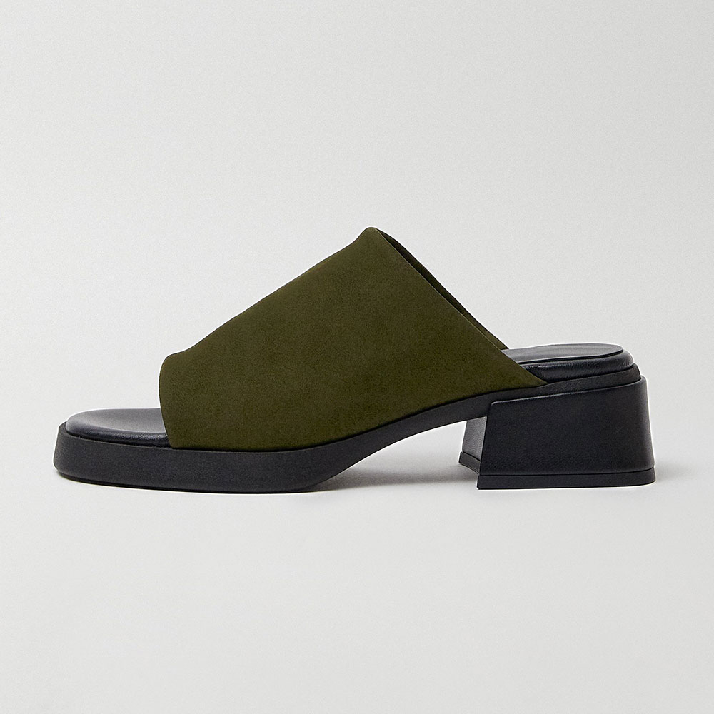 • Special Designs: The olive platform mules feature a lycra upper, an open square toe, and a chunky heel, designed for easy slip-on wear.