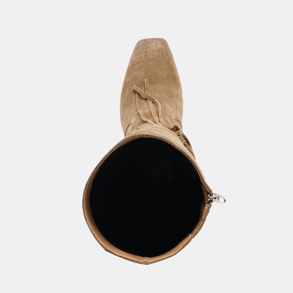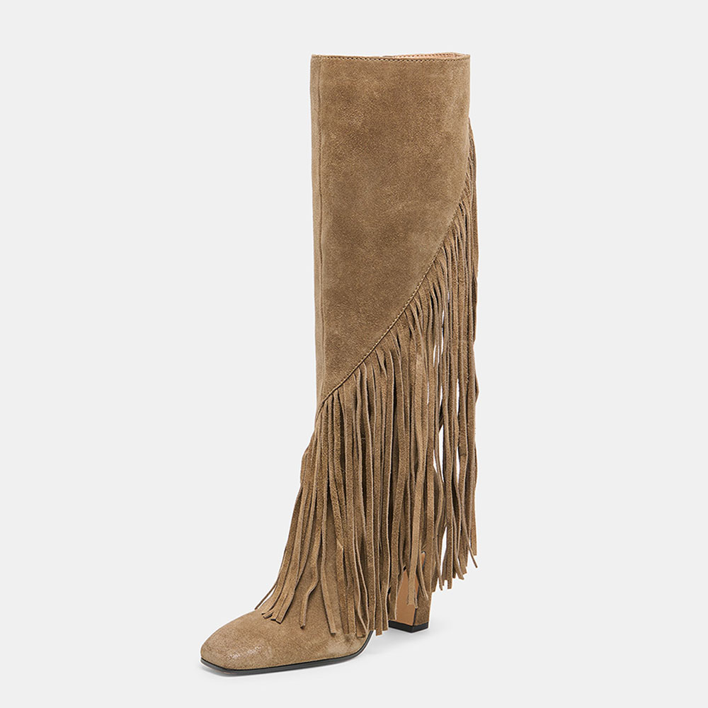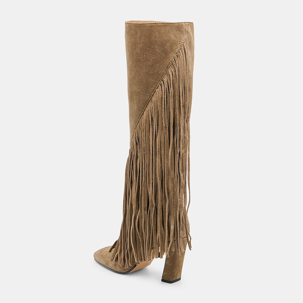Olive Vegan Suede Square Toe Fringe Side Zipper Tall Boots for Women