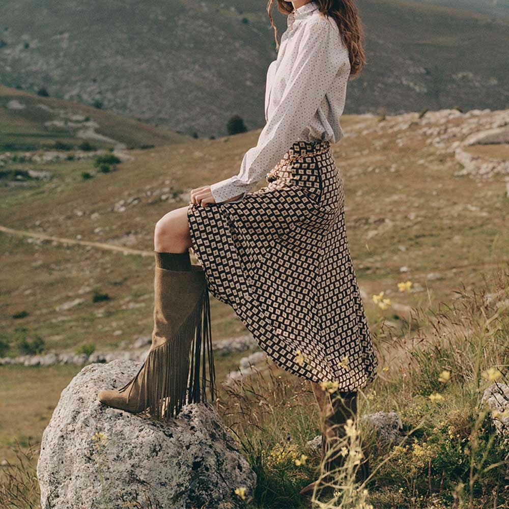Special Designs: The olive knee high boots feature long fringe details, a square toe, a side zipper, and a chunky heel.