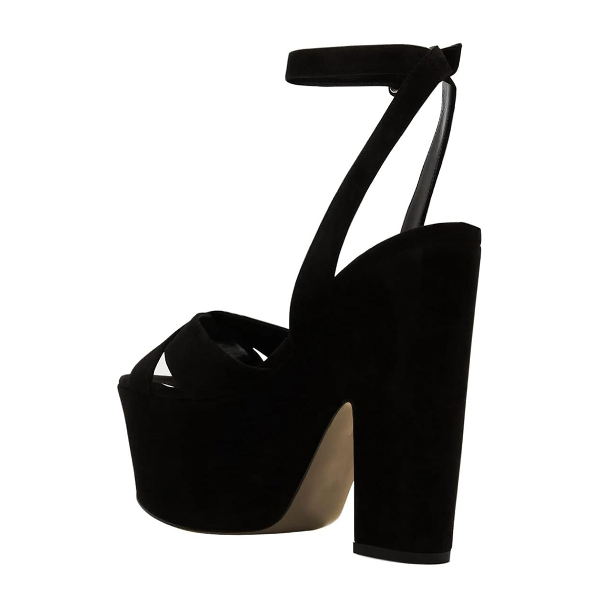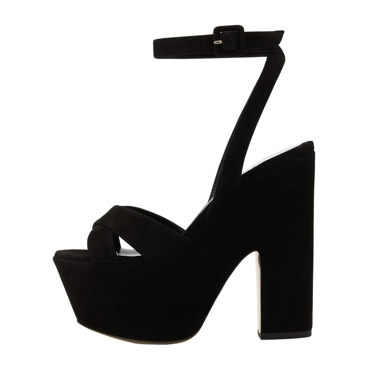 The black platform sandals feature criss-cross straps, an ankle strap with a buckle, and a chunky heel.