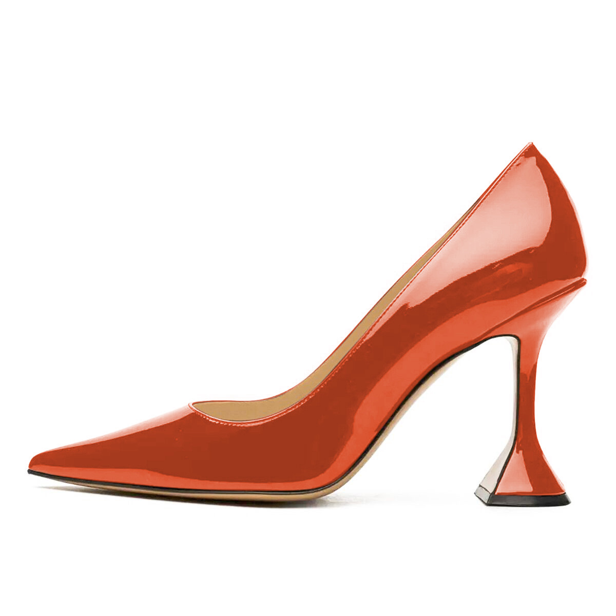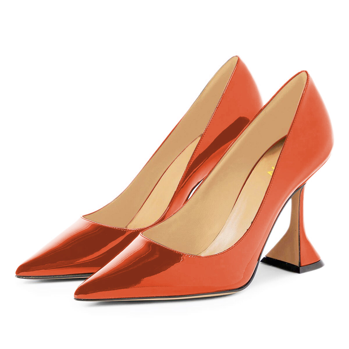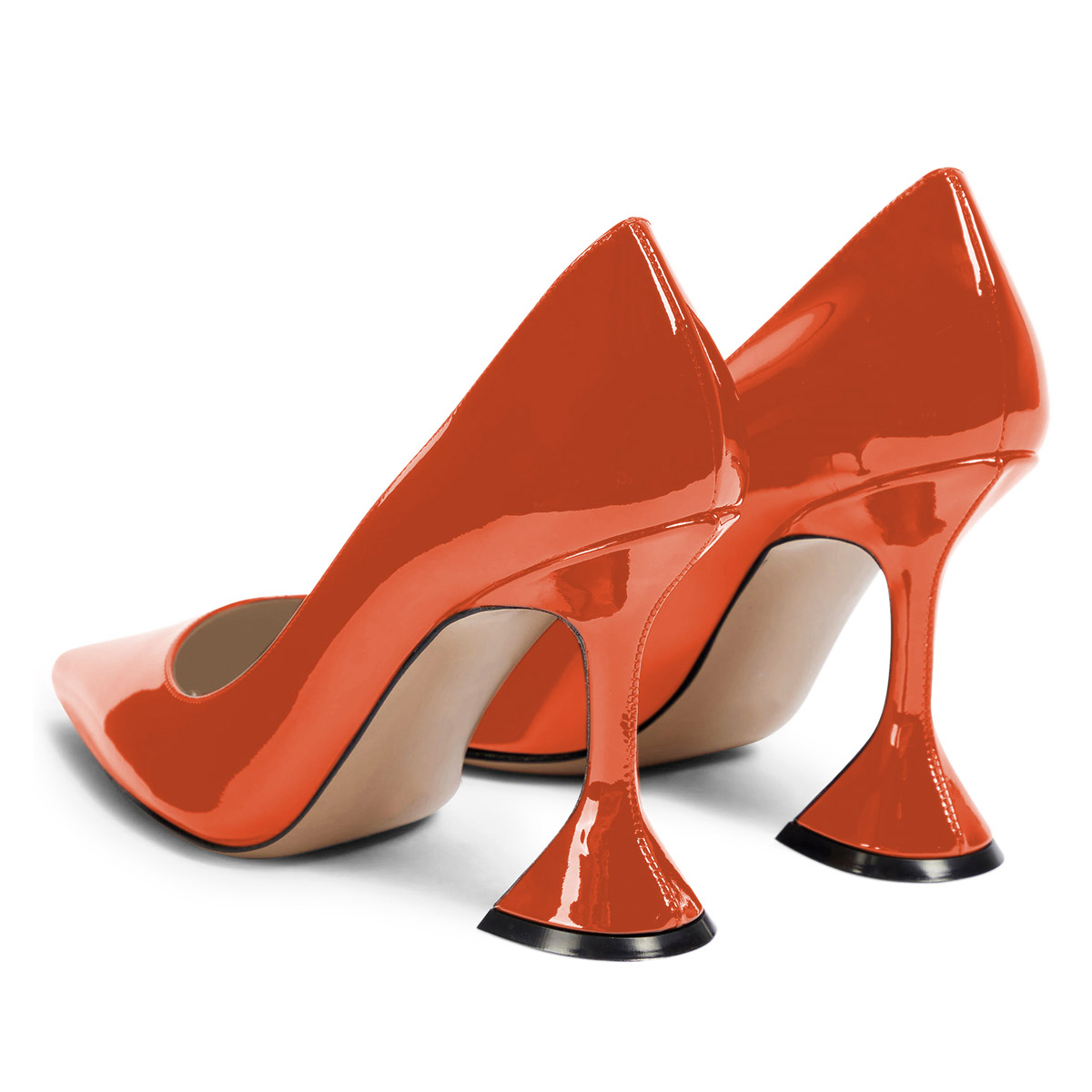 • Special Designs: Orange pumps feature a metallic finish, stylish pointed-toe and flared heel design.