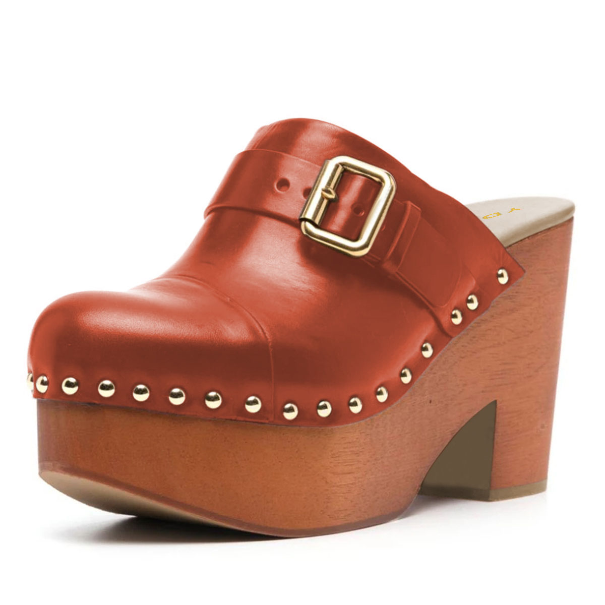 Orange Studded Buckle Strap Round Toe Platform Mules with Block Heel