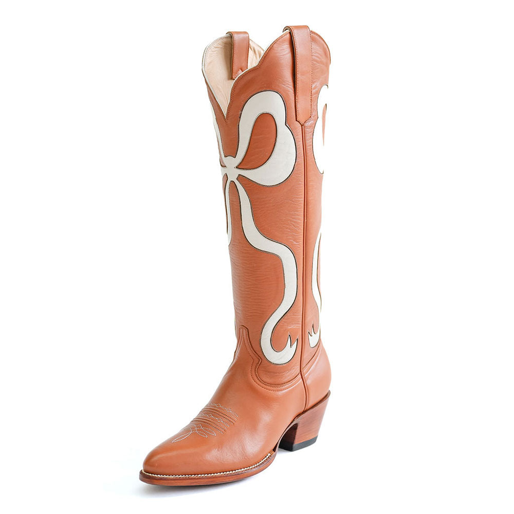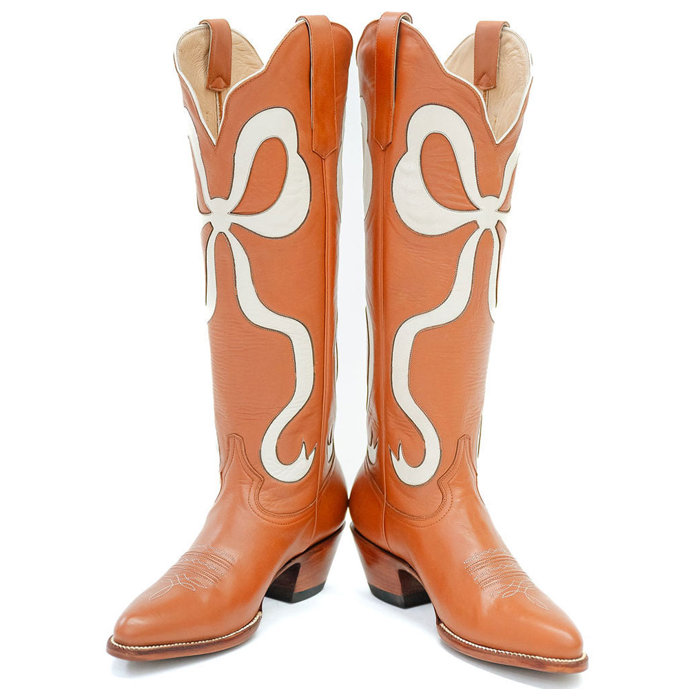 Orange & White Bow Inlay Cowgirl Boots with Chunky Heels