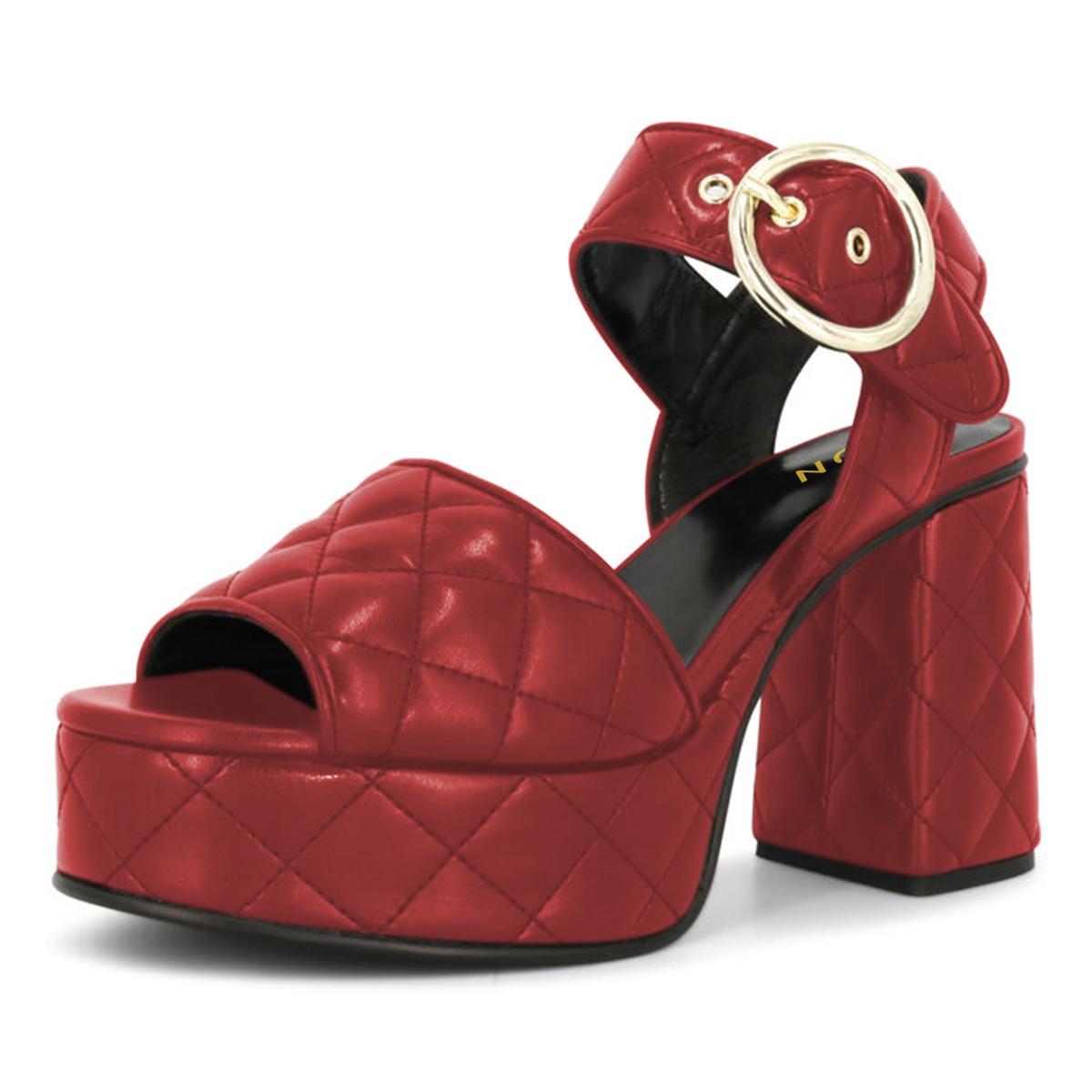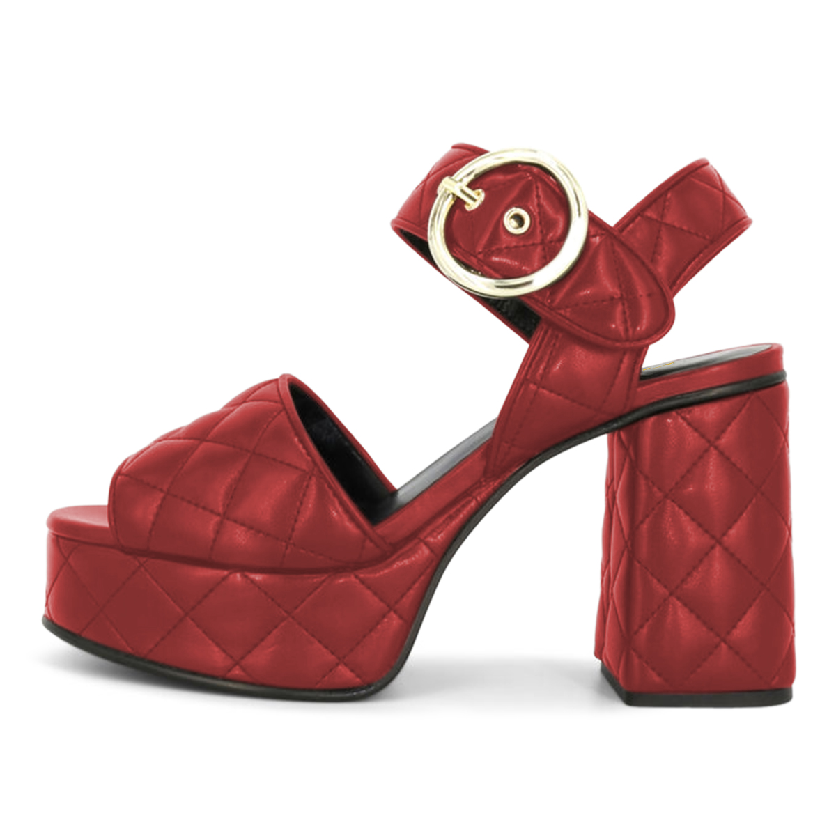 Special Designs: Red sandals feature padded vegan leather sophistication, bold platform and a buckle fastening strap design.