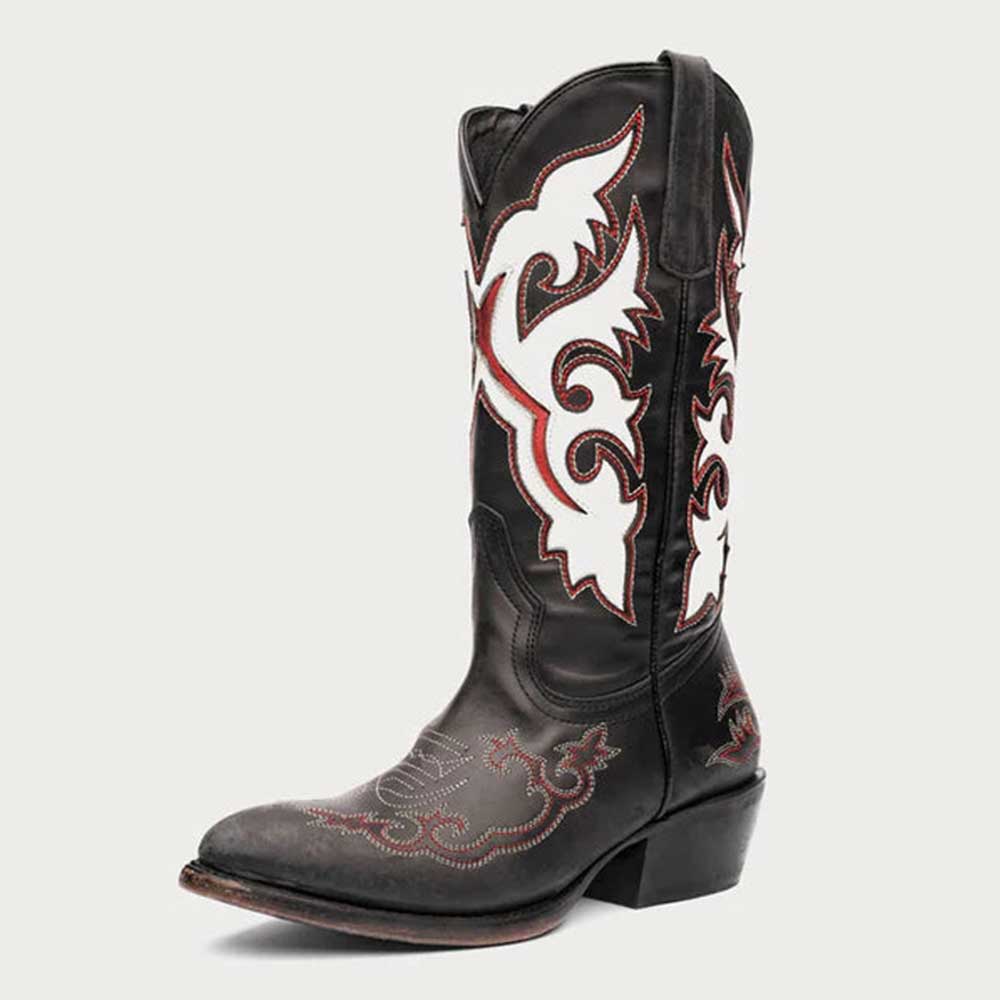Patchwork Pattern Chunky Heel Round Toe Black Cowboy Boots for Women