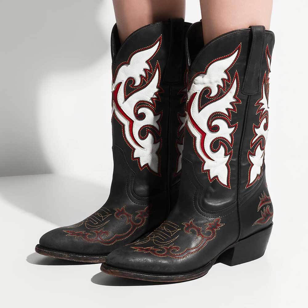 Special Designs: The faux leather round-toe cowboy boots feature red and white leather patchwork patterns