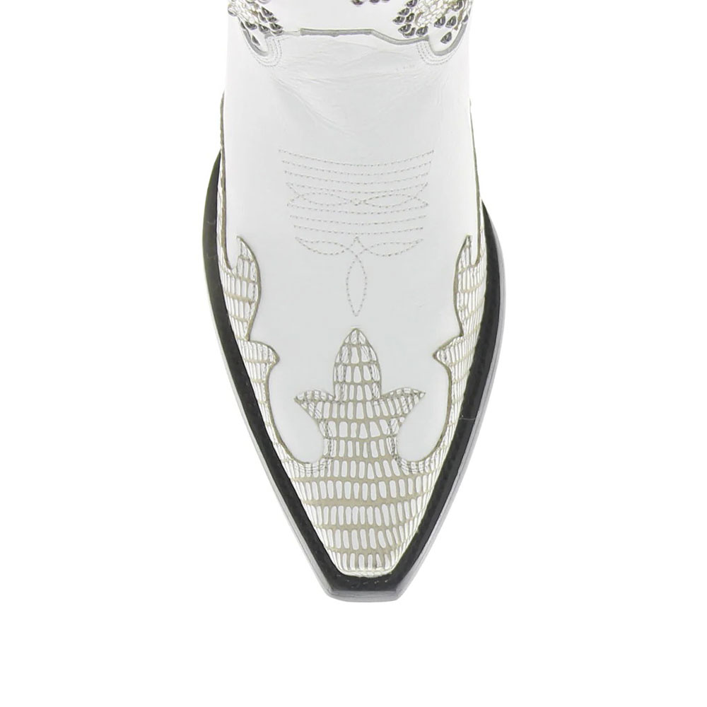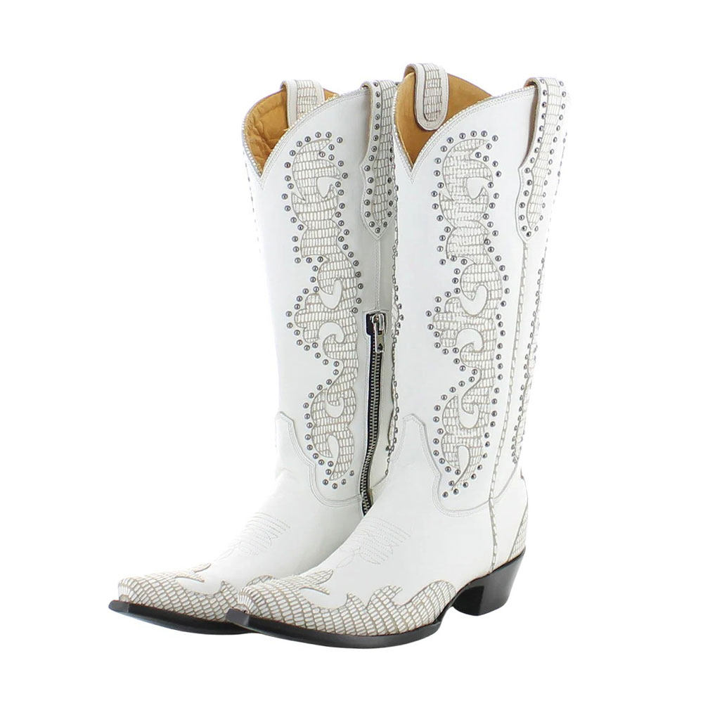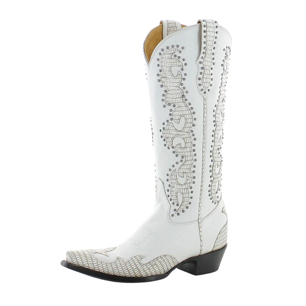 Patchwork Studded Embroidered Snip Toe Knee High White Cowgirl Boots