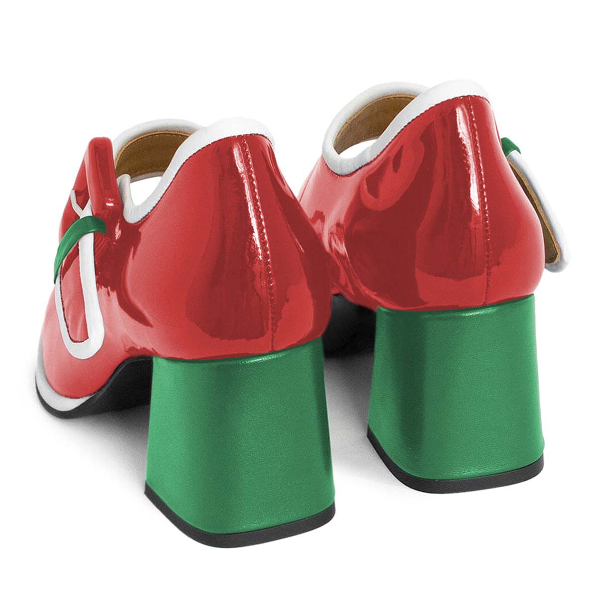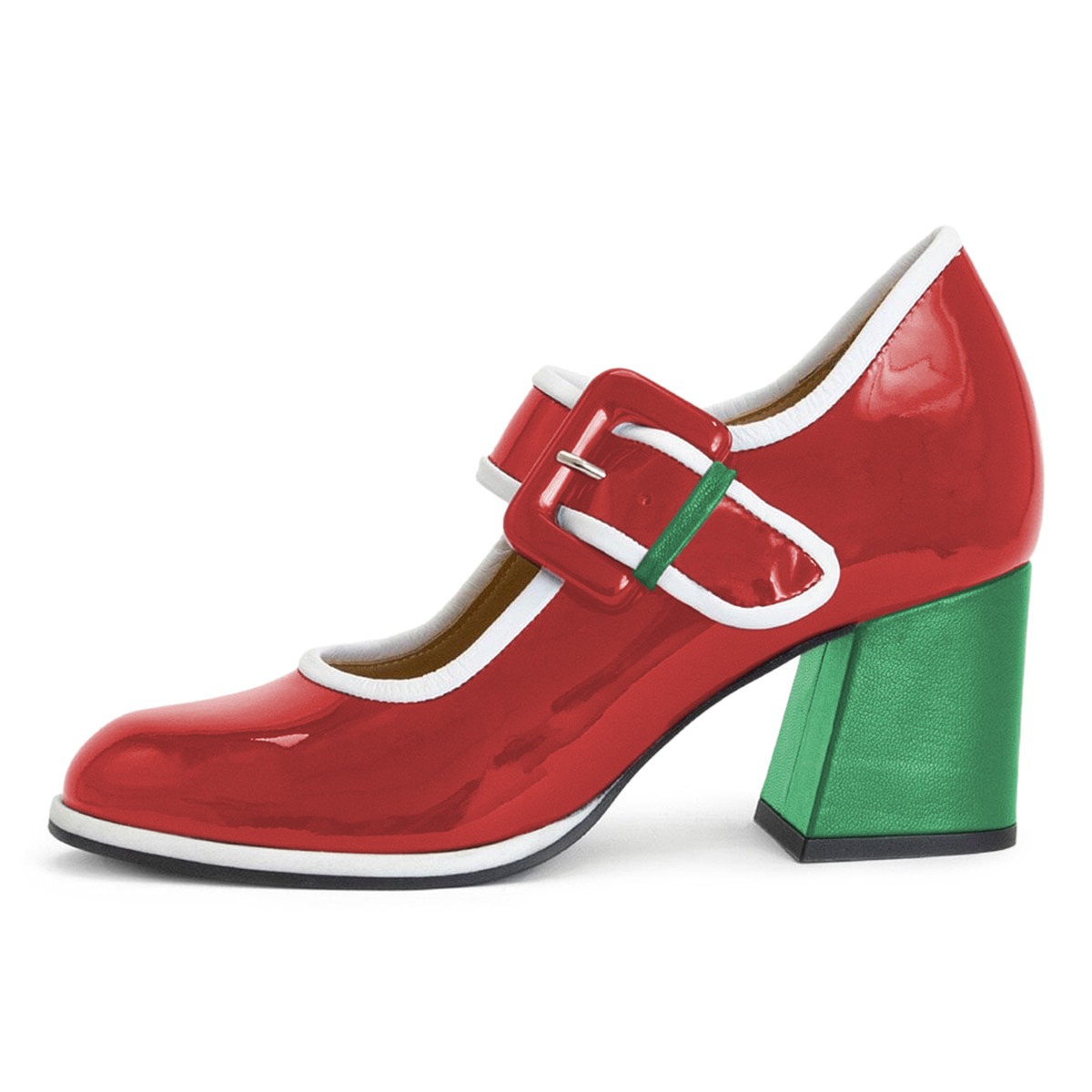 Special Designs: The red pumps feature a green mid-block heel, a closed toe, a white edge, and an adjustable buckle design.