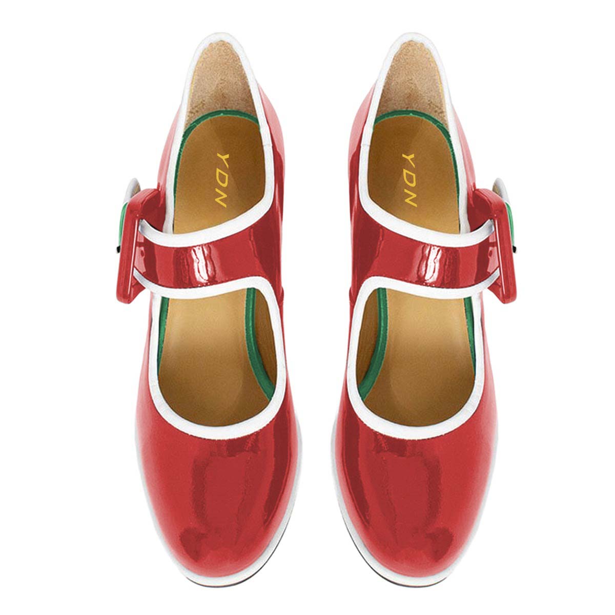 Patent Leather Closed Toe Block Heel Mary Jane Red Pumps with Buckle