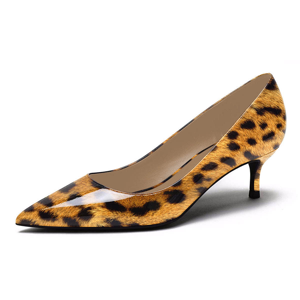 Special Designs: The pointed-toe pump shoes feature a chic leopard print and an elegant kitten heel.