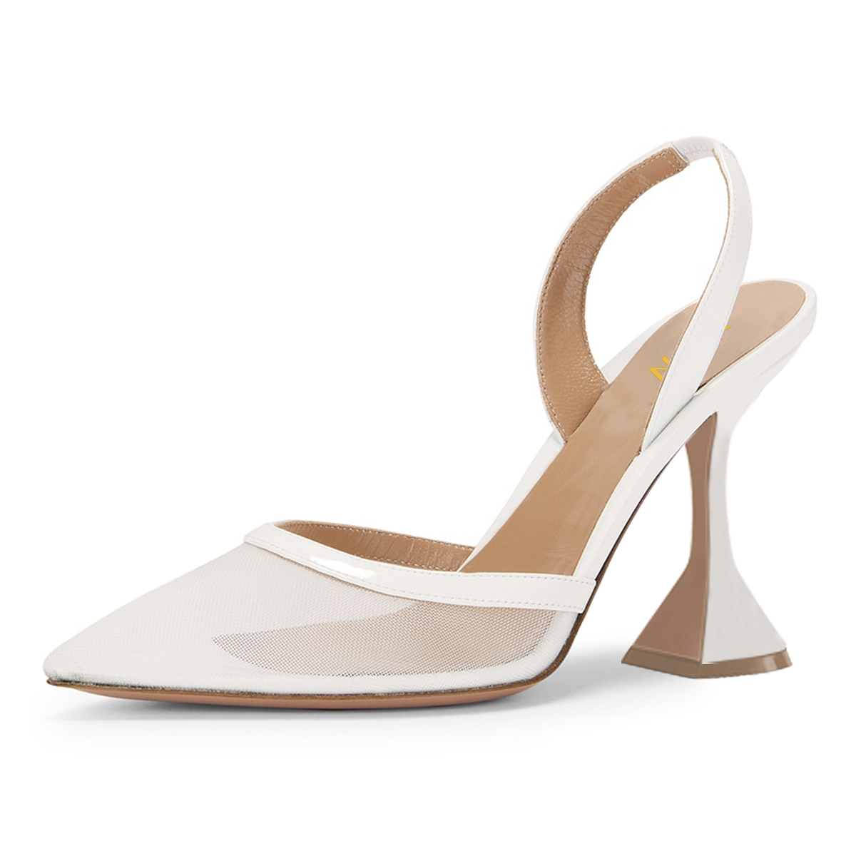 Patent Leather & Mesh Pointed Slingback Flared Heel Ivory Pumps