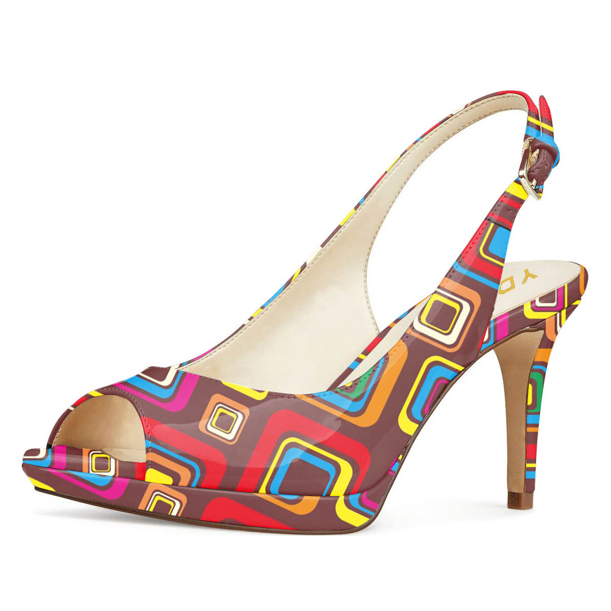 Special Designs: Multicolor enchanting square printed sandals featuring a buckle fastening slingback strappy design and a bold platform