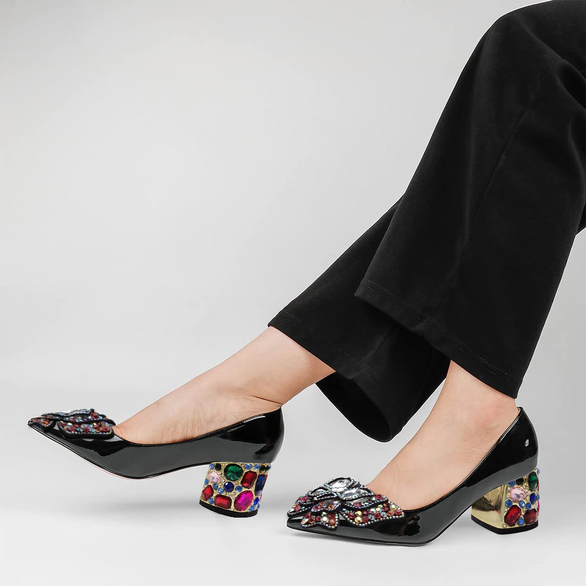 Patent Leather Pointed Colorful Rhinestone Butterfly Pumps in Black