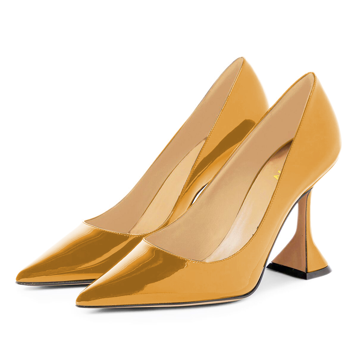 Patent Leather Pointed Toe Flared Heel Sparkling Golden Pumps