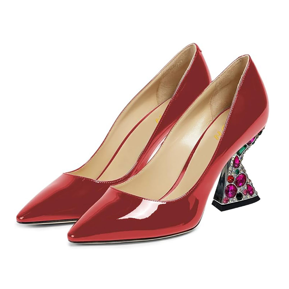 Patent Leather Pointed Toe Rhinestone Embellished Heel Pumps in Red