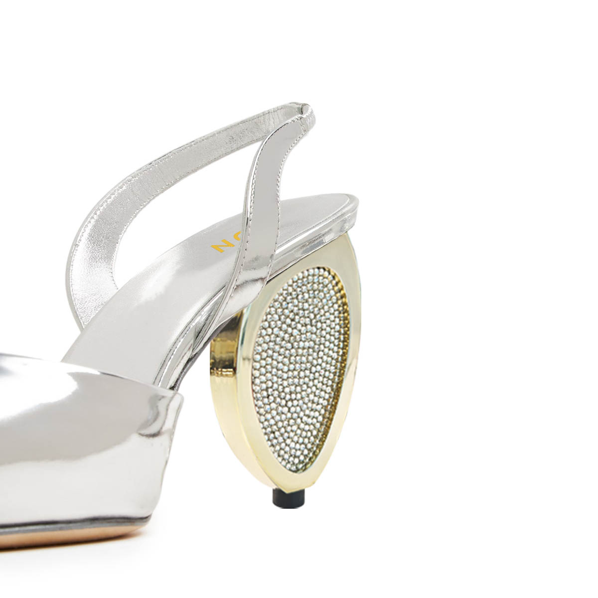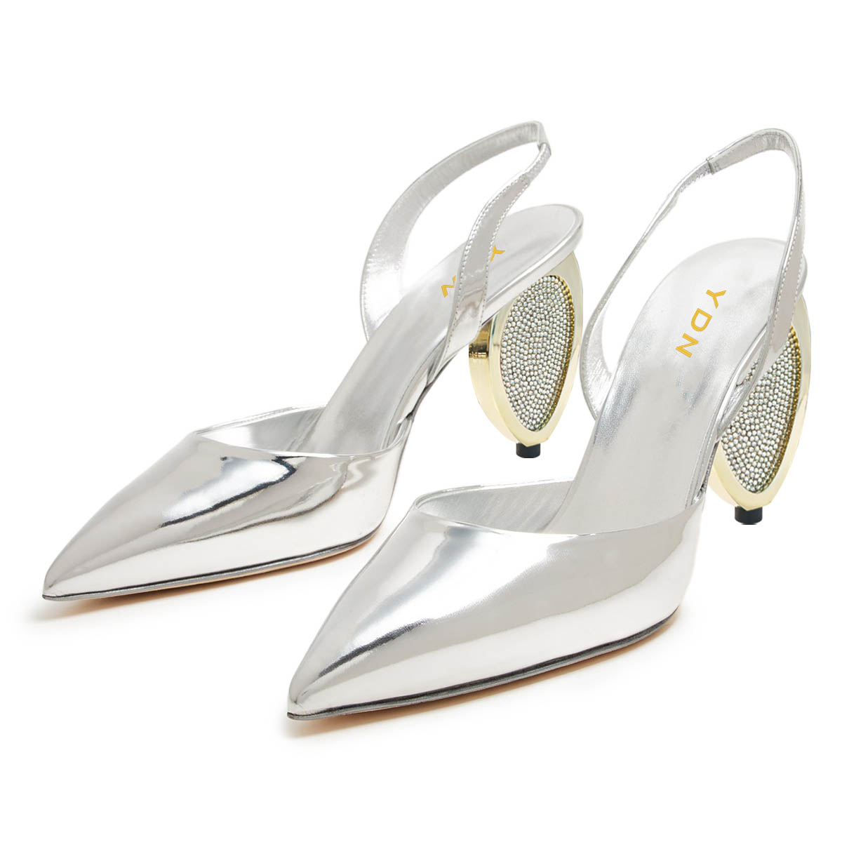 Patent Leather Pointed Toe Slingback Sculptural Heel Silver Pumps