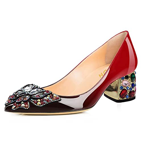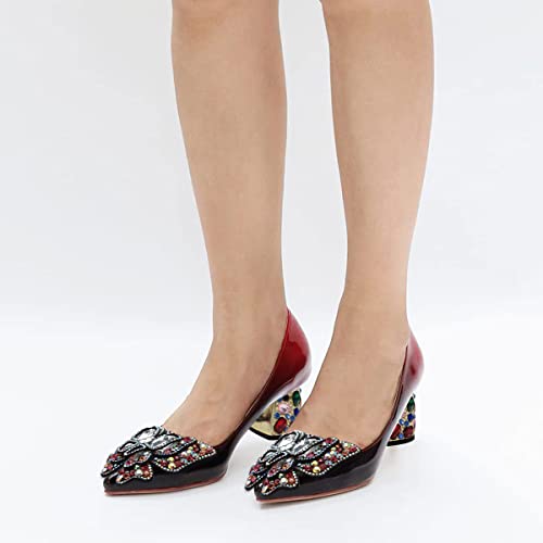 • Special Designs: Red pumps feature a rhinestoen embellished butterfly inlay and a decorative heel.
