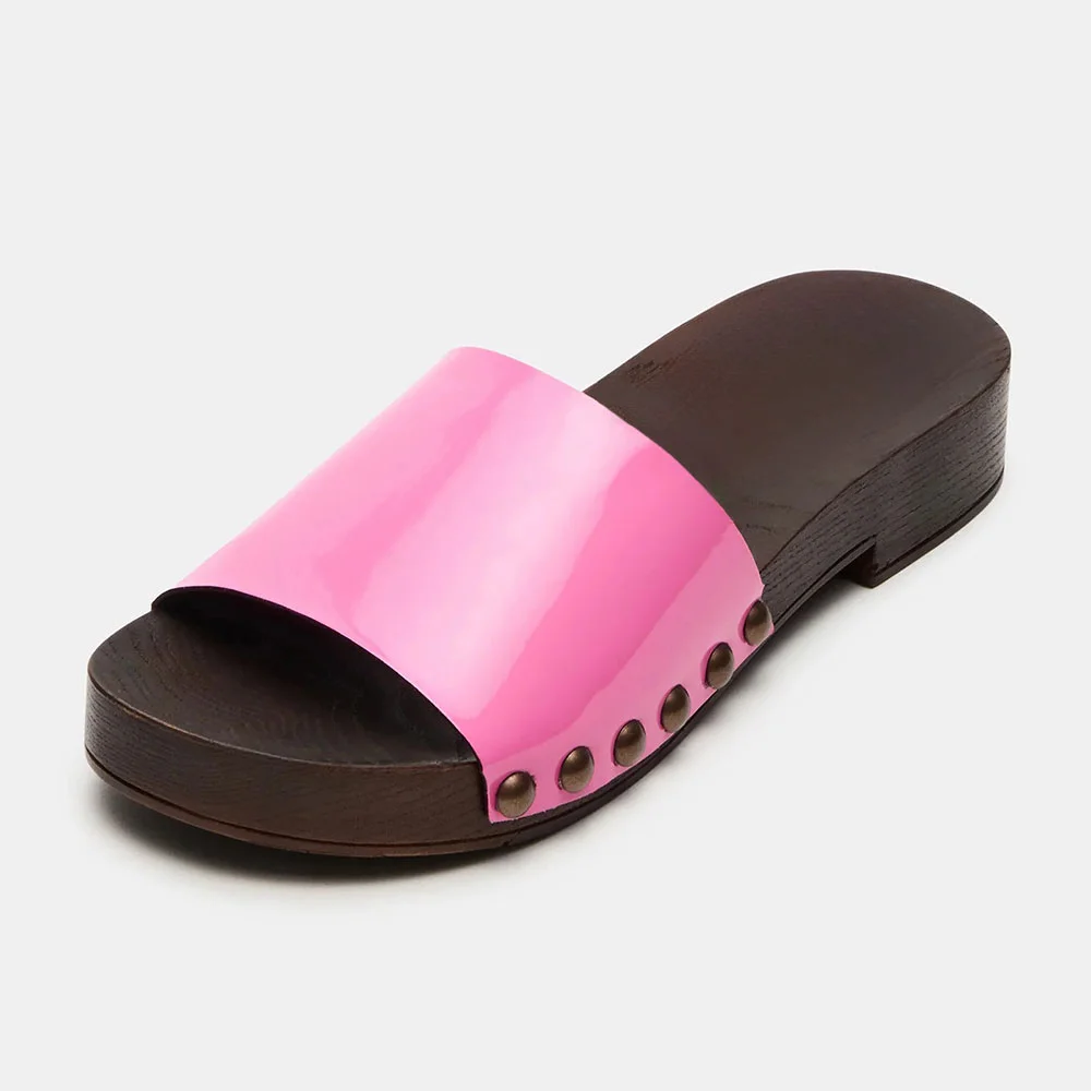 Patent Leather Round Toe Clog Studded Slide Shoes for Women in Pink